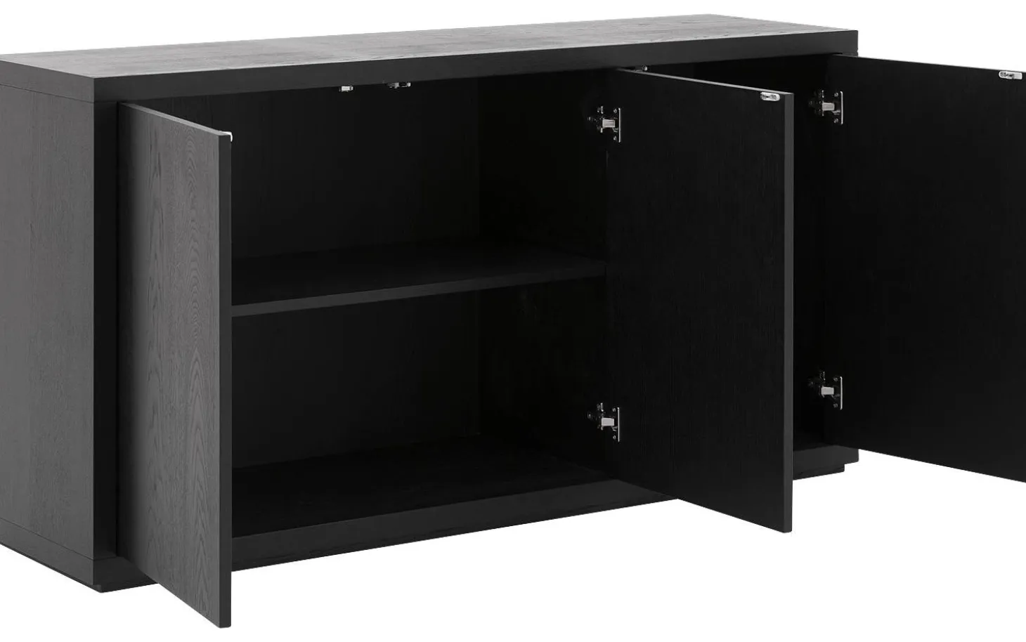 Sideboard Barcelona kombiniert robuste schwarze Eleganz mit praktischem Stauraum. Dieses Eichen-Sideboard mit lackierter Oberfläche sorgt für eine natürliche Ausstrahlung, die Ihrem Interieur sofort Charakter verleiht. Das praktische Push-to-Open-System hält die klaren Linien intakt, während der großzügige Stauraum hinter den drei Türen alles ordentlich außer Sichtweite hält.