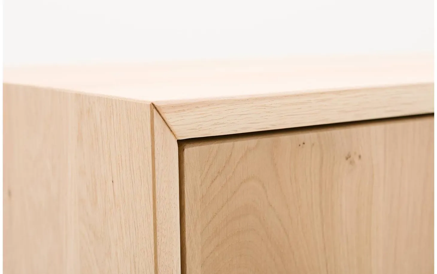 Die drei Türen des Sideboards Luuk öffnen Sie mit einem einfachen Druck, dank des cleveren Push-to-Open-Systems. Dies sorgt für eine klare, minimalistische Ausstrahlung ohne Griffe, die die reinen Linien stören würden. Die unbehandelte Eiche lässt die natürliche Holzmaserstruktur vollständig zur Geltung kommen.