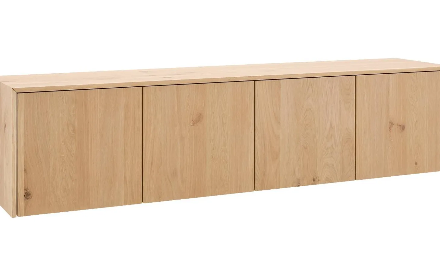 Die Stärke des Sideboards Luuk liegt in seiner Einfachheit. Die unbehandelte Eiche lässt die natürliche Maserung vollständig zur Geltung kommen. Jedes Exemplar hat seinen eigenen einzigartigen Charakter durch die natürliche Holzstruktur. Die vier Türen öffnen sich einfach mit einem leichten Druck dank des praktischen Push-to-Open-Mechanismus.