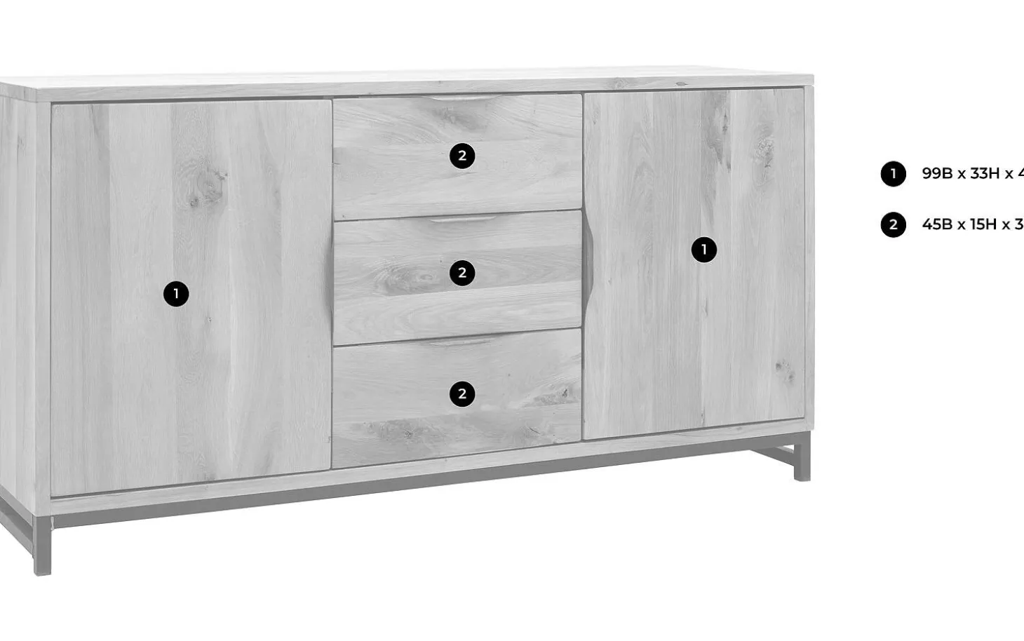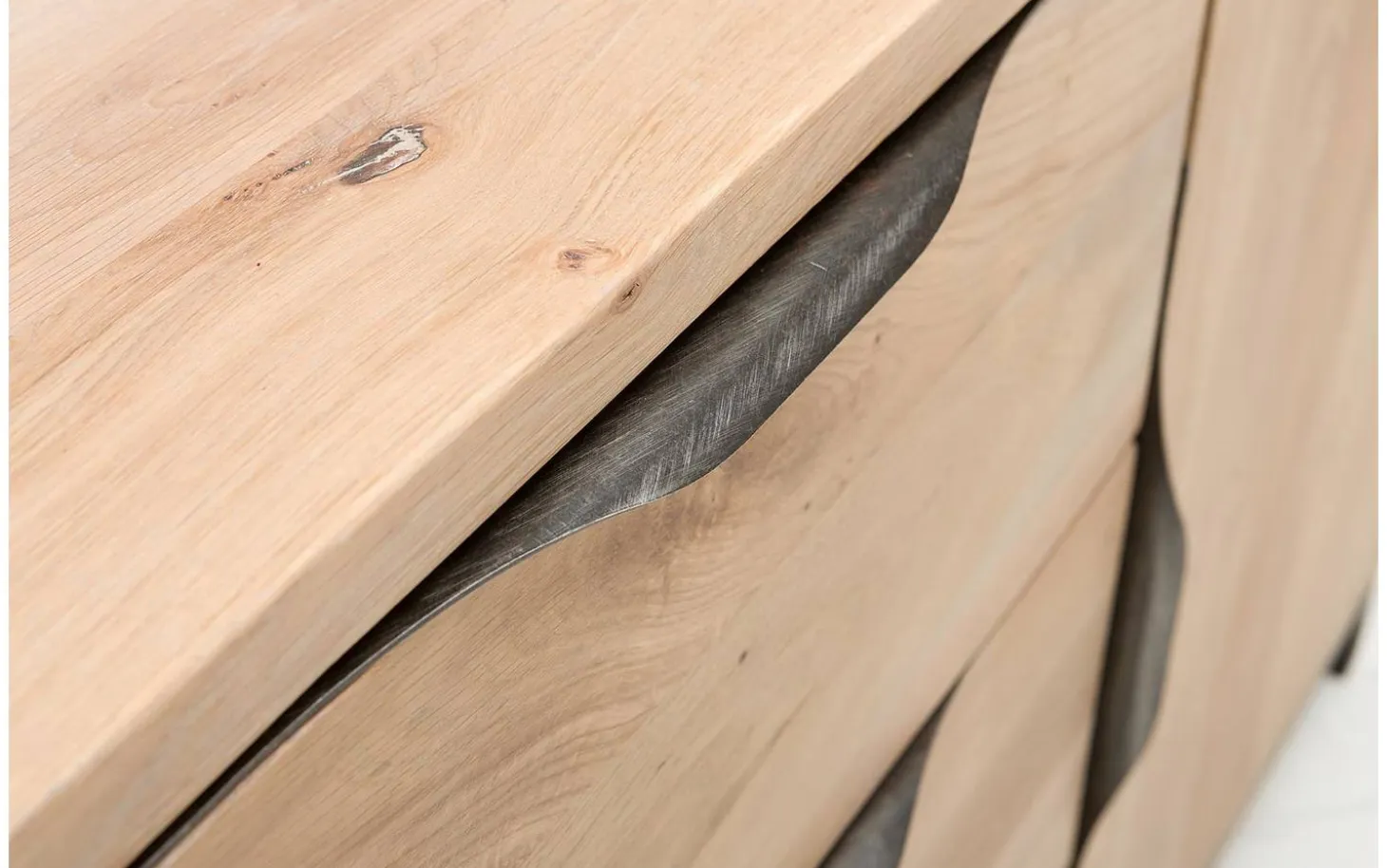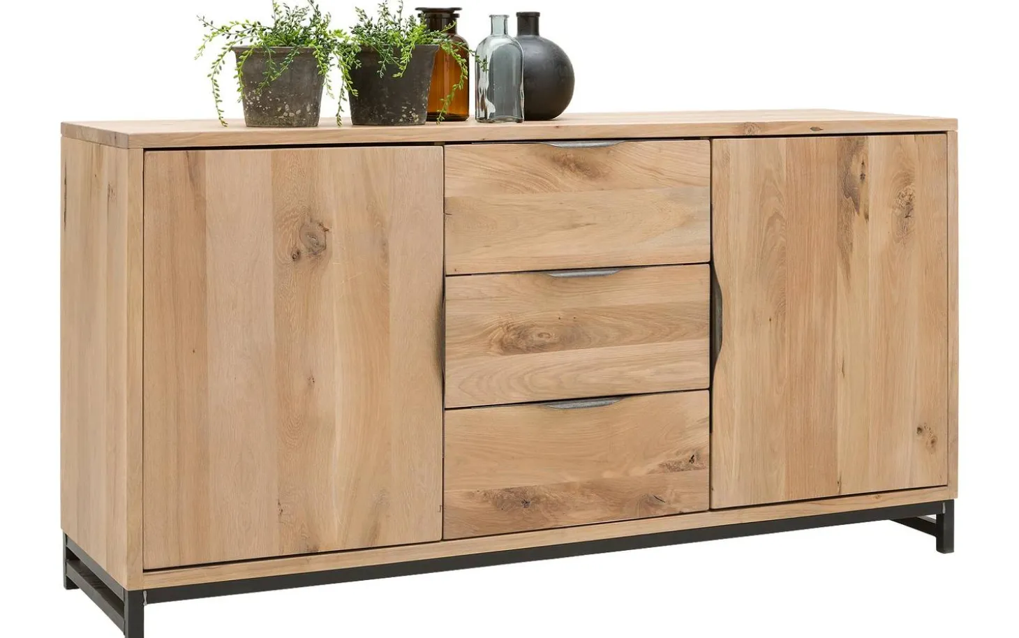 Die unbehandelte Eichen-Verarbeitung verleiht dem Sideboard Max seine charakteristische Ausstrahlung. Durch die gebürstete Struktur kommt die natürliche Holzmaserung wunderschön zur Geltung. Die schwarzen Metallbeine sorgen für einen schönen Kontrast und machen das Ganze robust und markant.