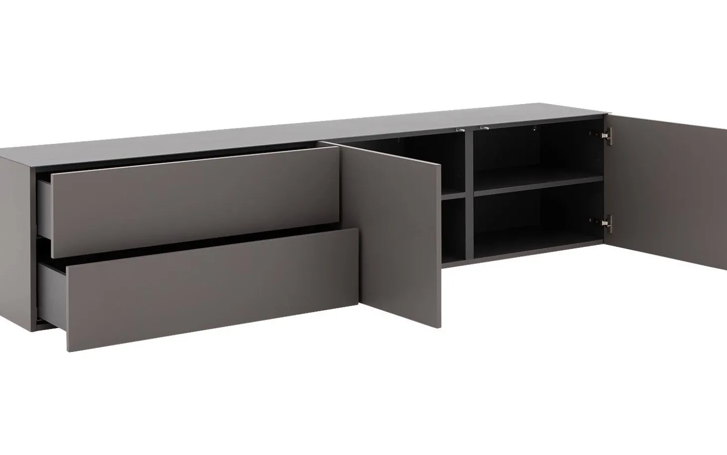 Mit zwei Türen und zwei Schubladen bietet dieses schwebende Sideboard reichlich Möglichkeiten für Aufbewahrung und Styling. Die asymmetrische Aufteilung mit Türen rechts und Schubladen links sorgt für ein verspieltes und funktionales Ganzes. Perfekt für eine aufgeräumte und persönliche Ausstrahlung.