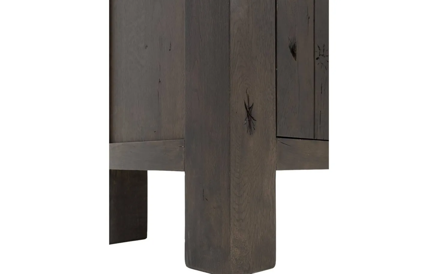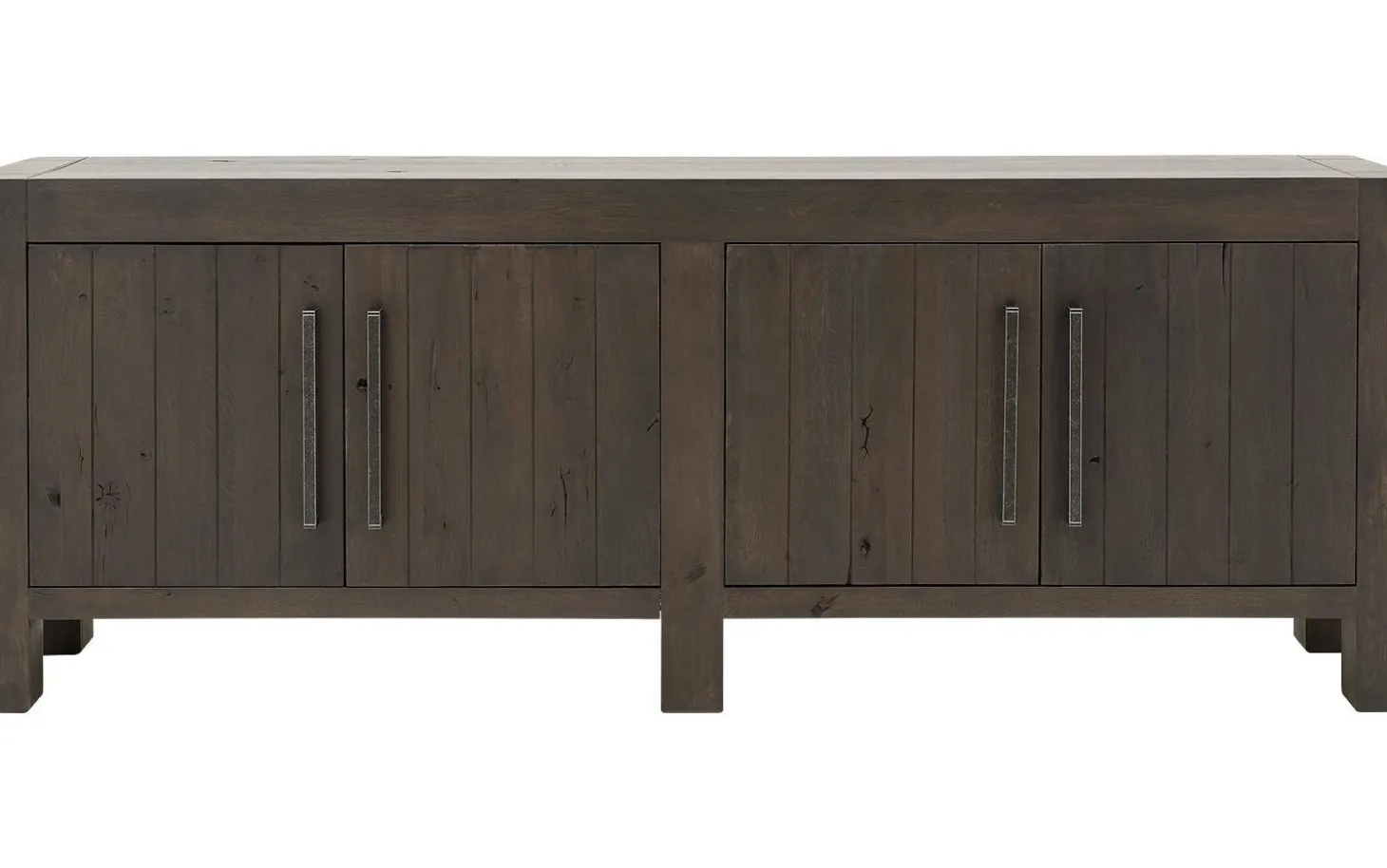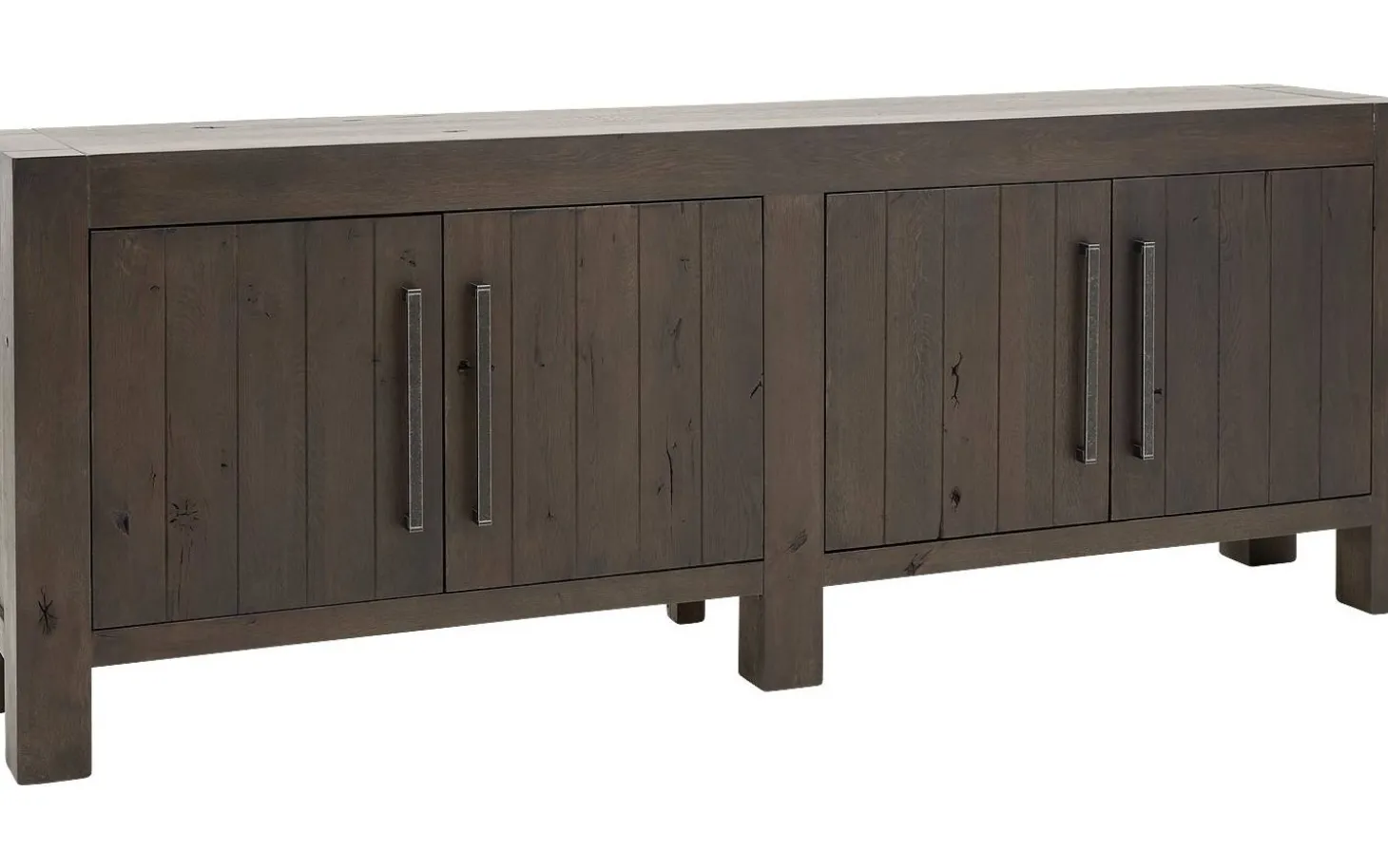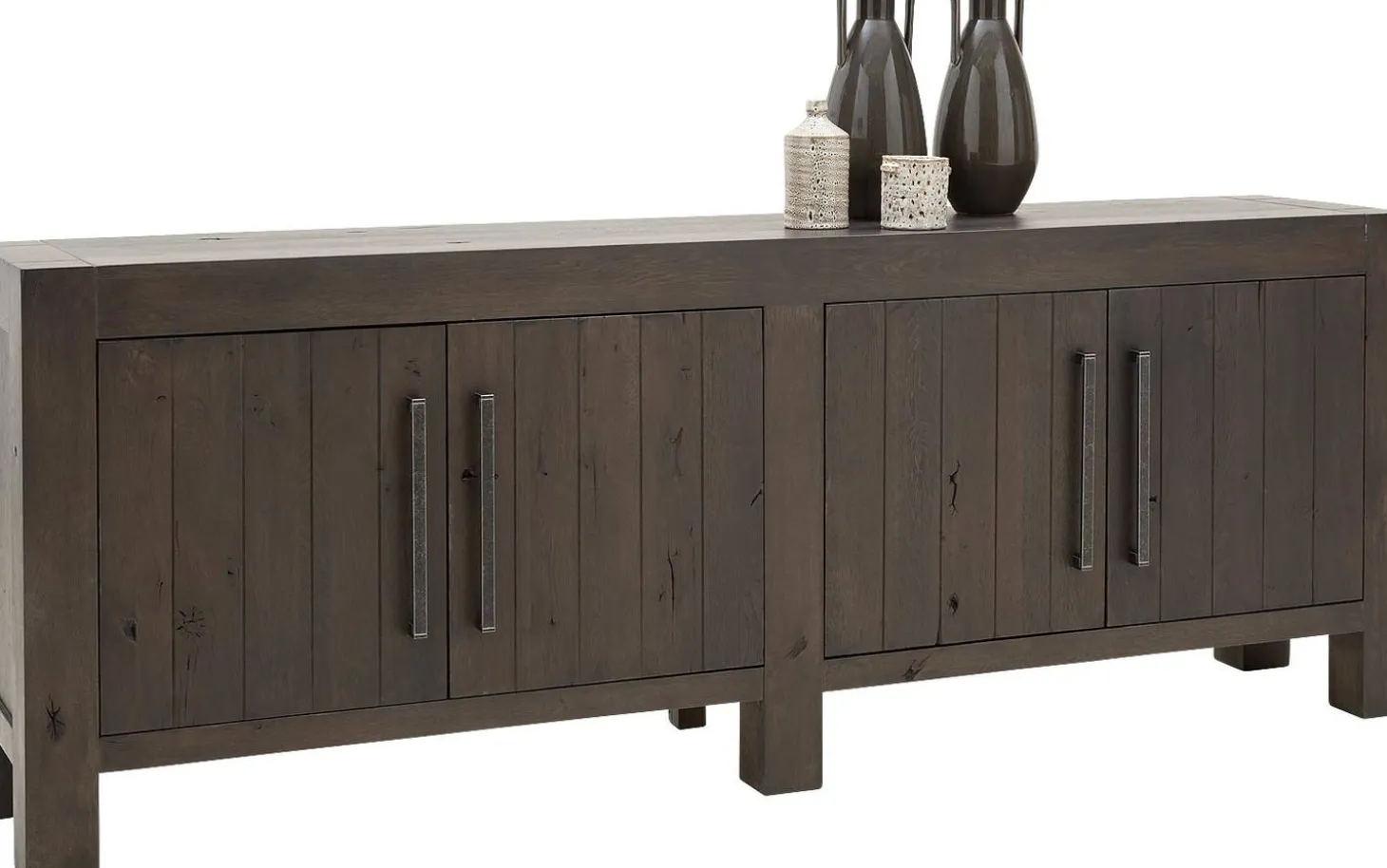 Sideboard Roots bringt die Kraft der Natur direkt in Ihr Zuhause. Die grobe Holzstruktur und gebürstete Verarbeitung verleihen diesem grauen Eichen-Sideboard eine robuste, authentische Ausstrahlung. Mit vier geräumigen Türen und Soft-Close-System kombinieren Sie natürliche Schönheit mit praktischem Bedienkomfort.