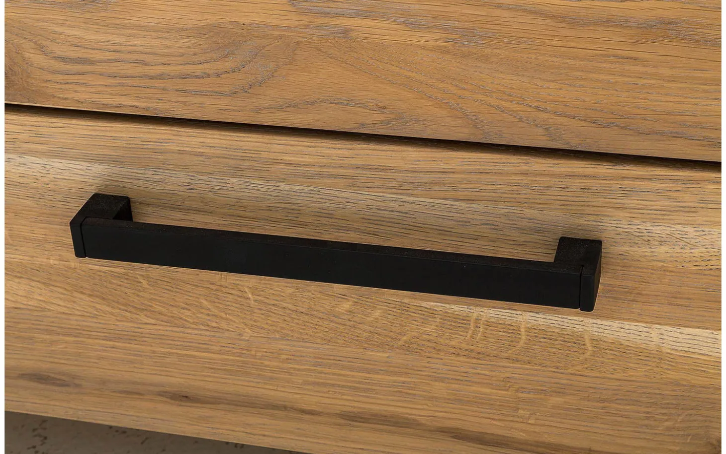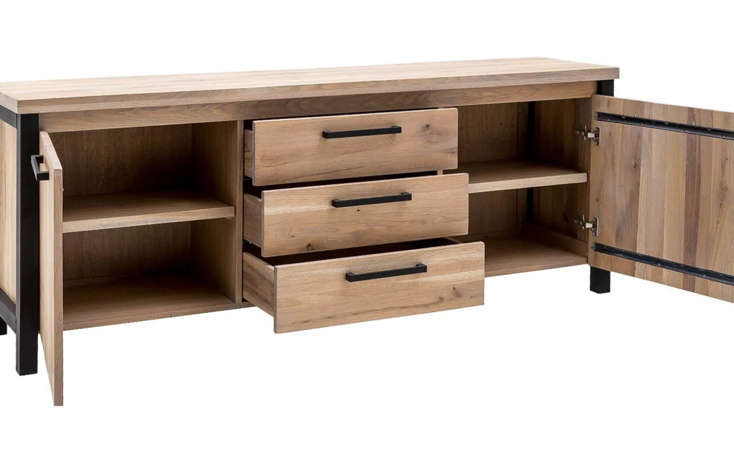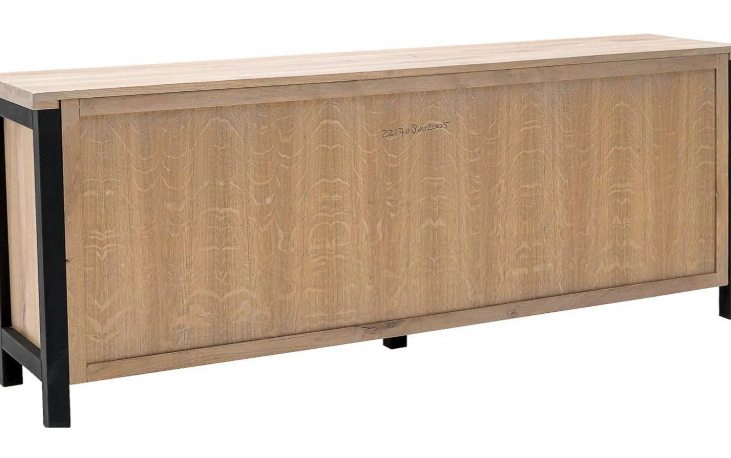Sideboard Santos strahlt industriellen Charme aus durch die Kombination von warmem Eichenholz mit robusten schwarzen Metallakzenten. Mit seiner beeindruckenden Breite von zwei Metern wird dieses Sideboard zu einem Statement in jedem Raum. Die Ölbehandlung erhält die natürliche Holzstruktur und verleiht eine warme, authentische Ausstrahlung.