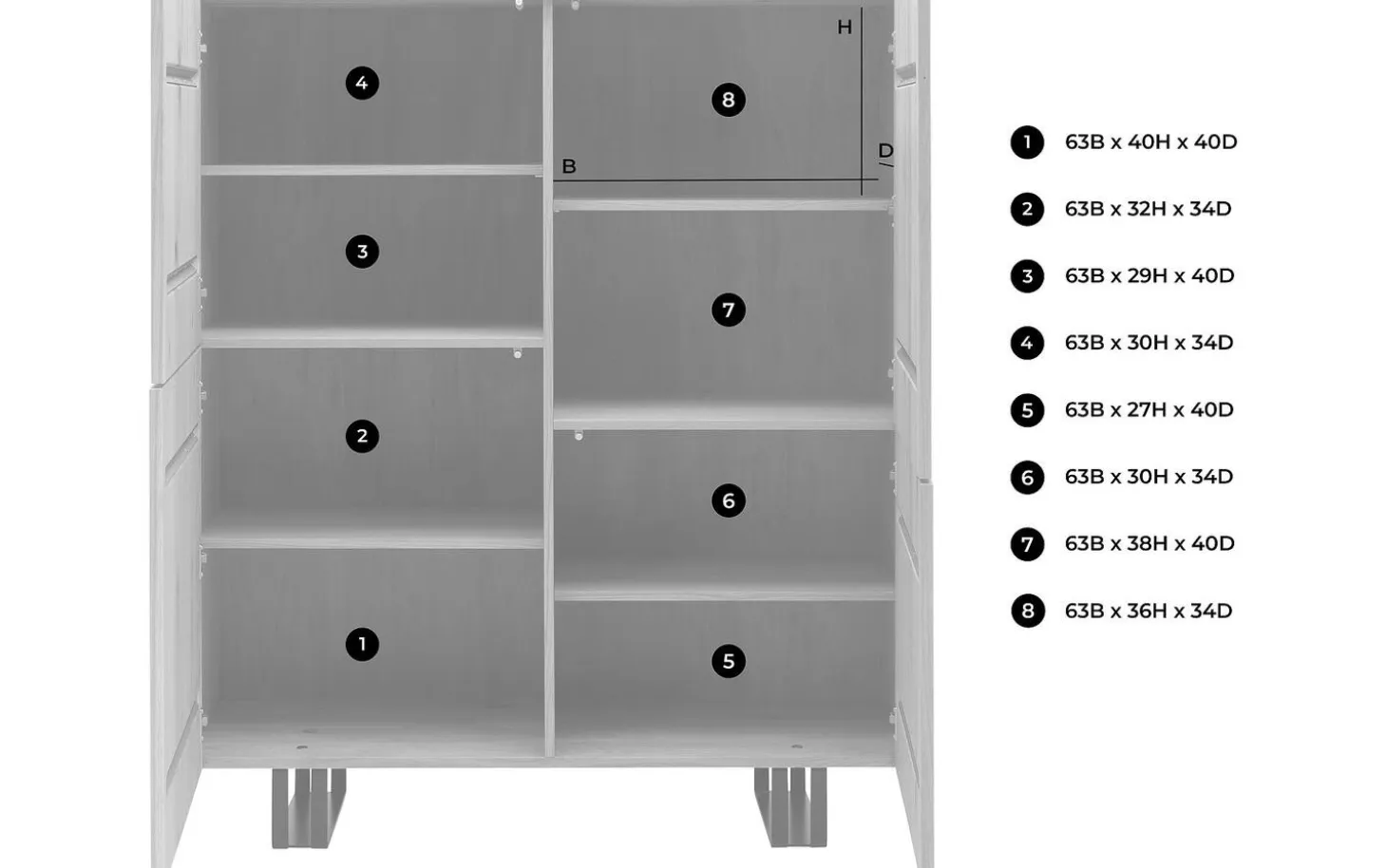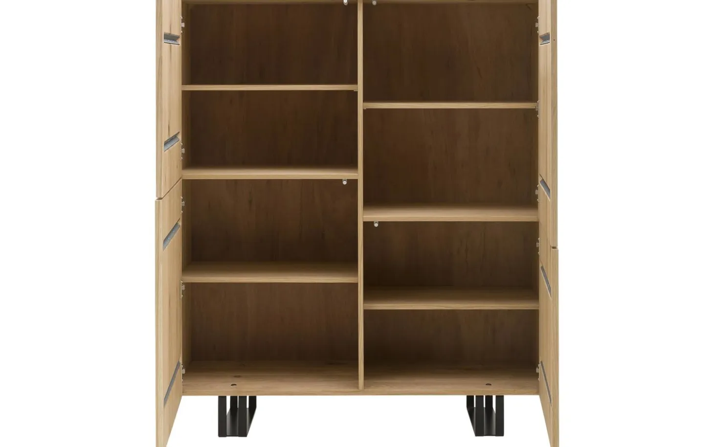 Die erhöhte Aufstellung auf Metallbeinen macht das Reinigen unter dem Schrank einfach und verleiht Ihrem Interieur eine luftige Ausstrahlung. Hinter den vier Türen finden Sie genügend Platz für alles, was Sie ordentlich außer Sichtweite halten möchten – von Unterlagen bis zu Spielen und von Handtüchern bis zu saisonalen Gegenständen.