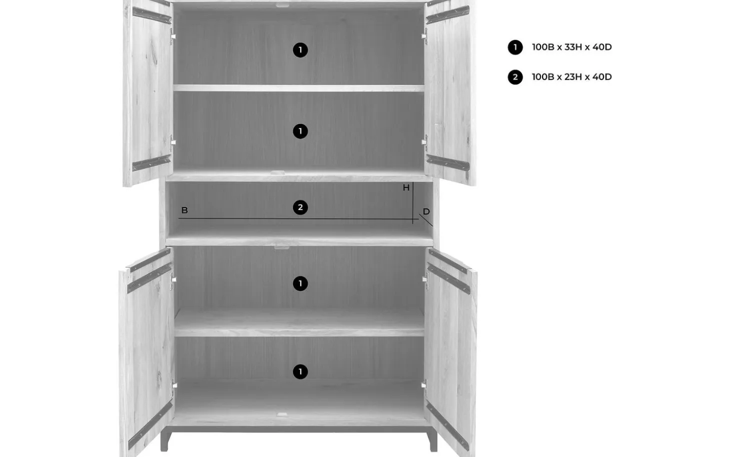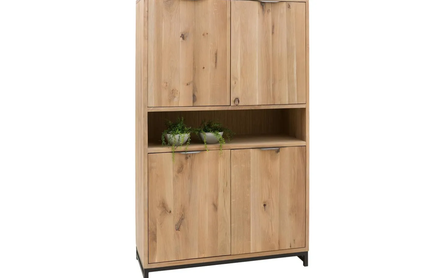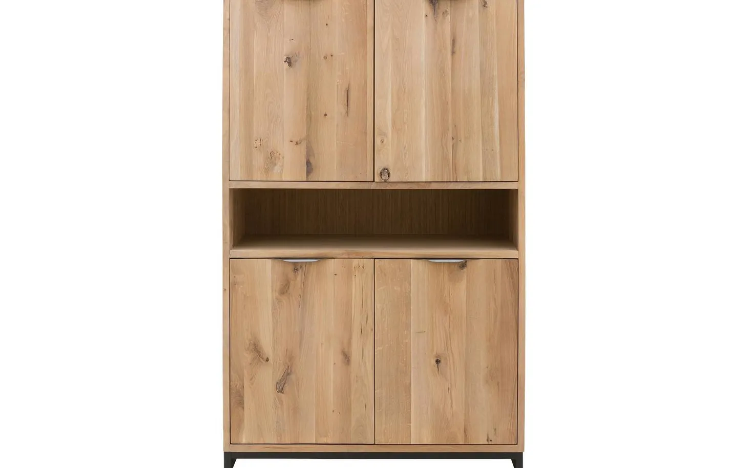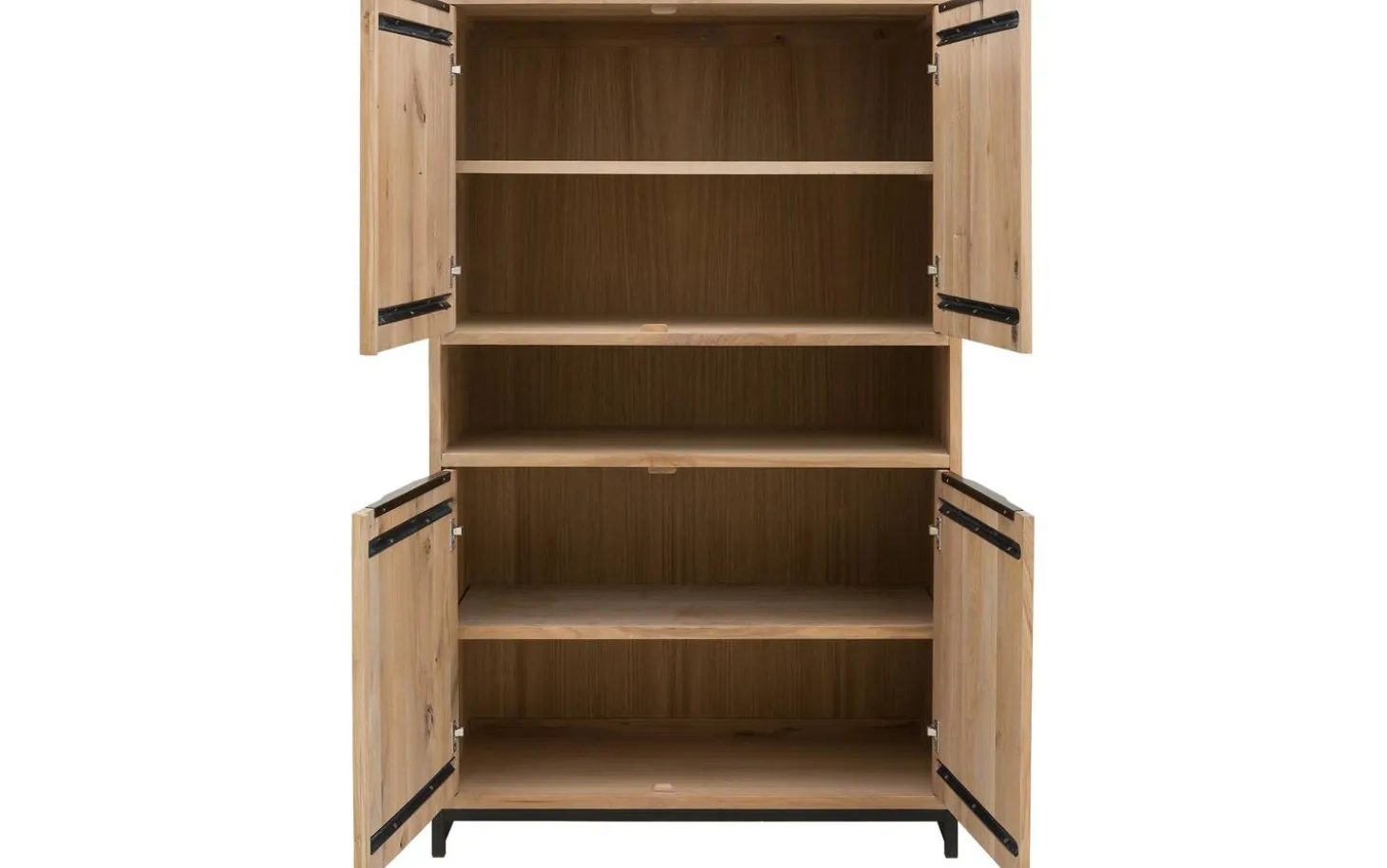Die vier Türen öffnen sich geschmeidig und schließen dank des Soft-Closing-Systems immer sanft – auch wenn Sie sie versehentlich zudrücken. Die stabilen Metallgriffe liegen gut in der Hand und fügen dem warmen Holz einen industriellen Akzent hinzu.