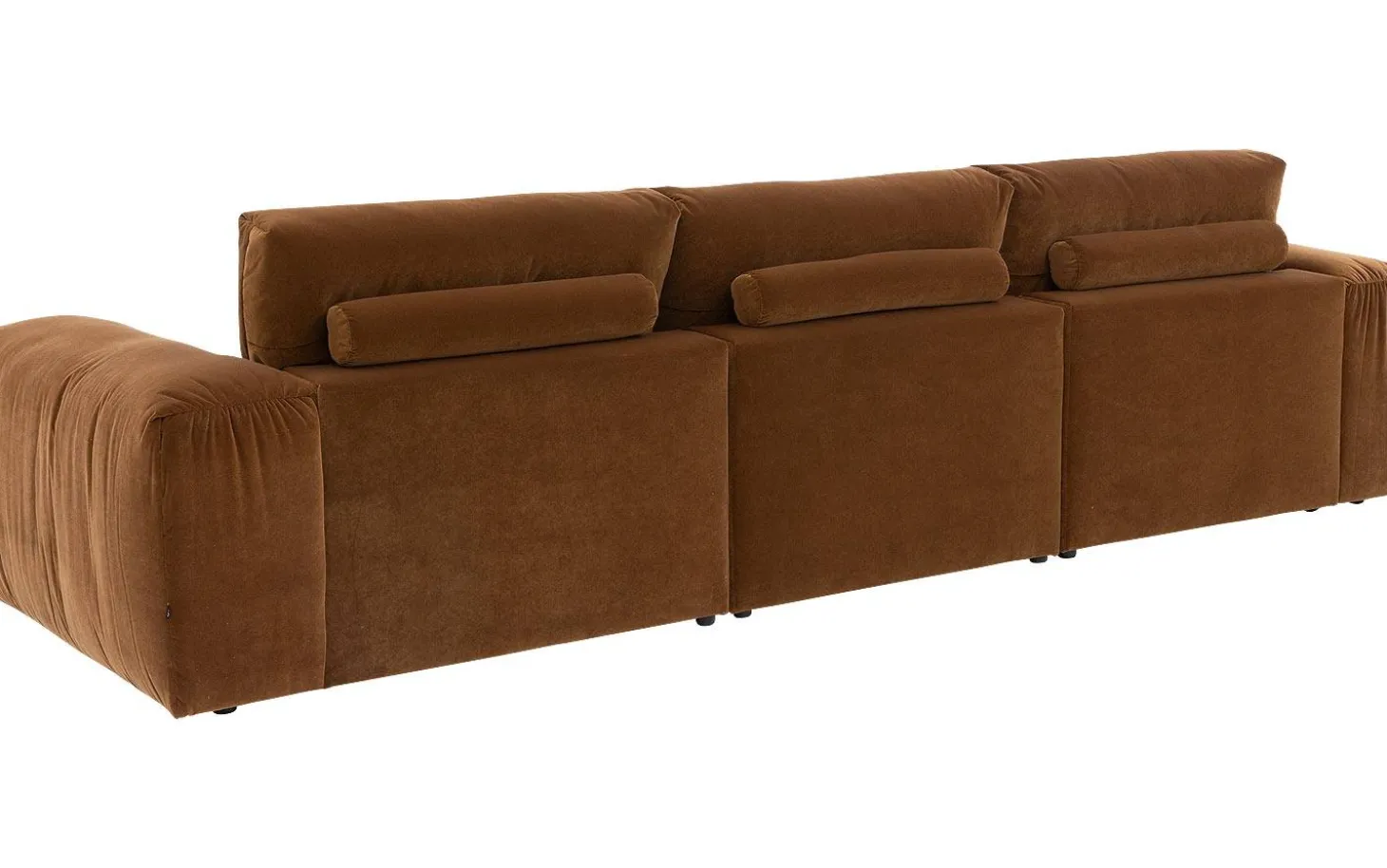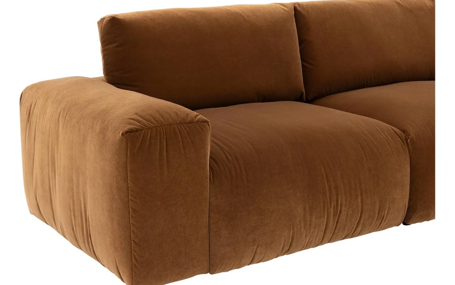 Het zachte veloursmateriaal in de warme bruine kleur ‚wood‘ geeft hoekbank Amara een knusse en uitnodigende uitstraling. De velours heeft een subtiele glans die het licht mooi weerkaatst en voelt heerlijk zacht aan.