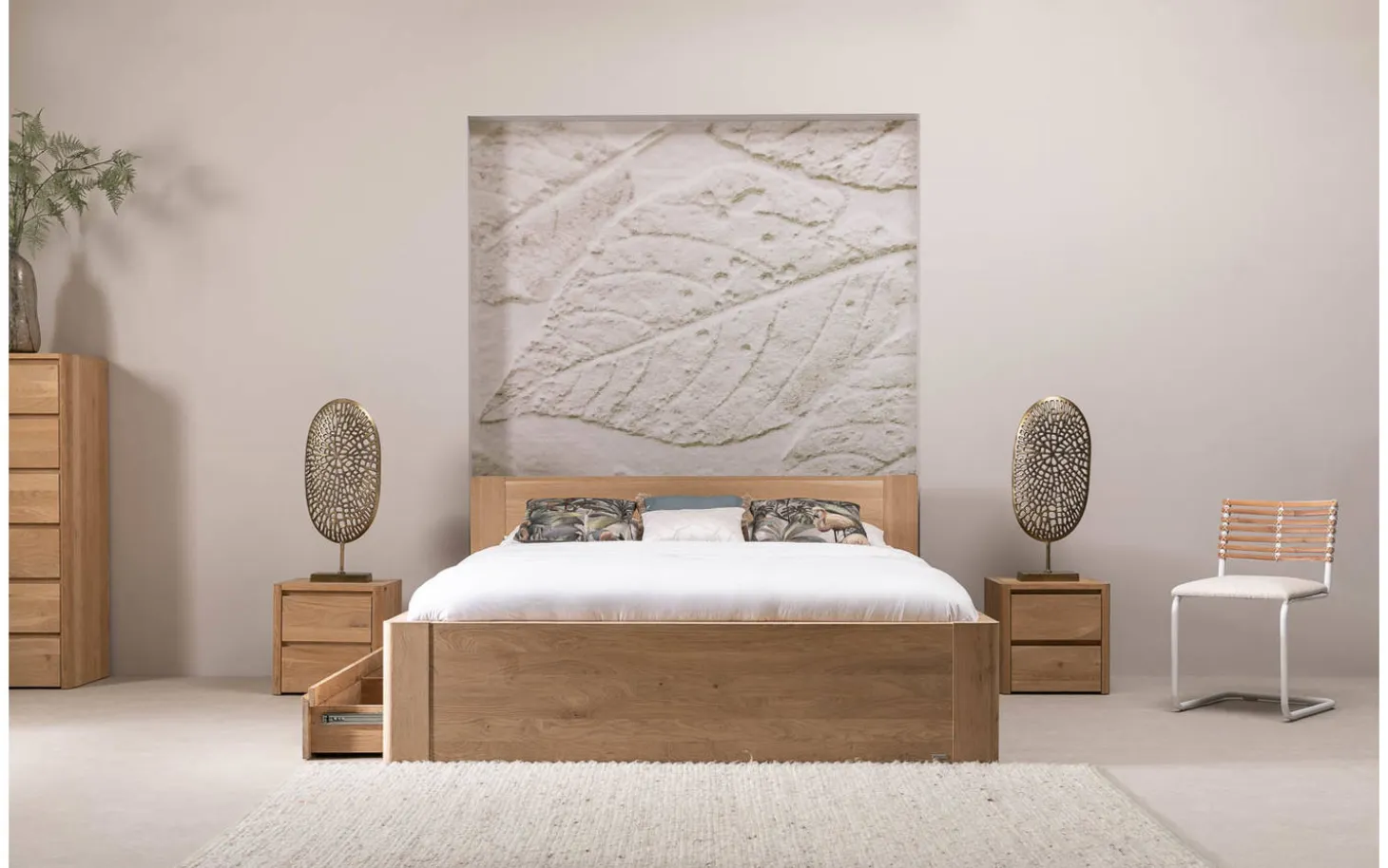 Sie möchten im Bett Bibi himmlisch einschlummern? Kein Problem! Das massive Eichenholz und das geradlinige Design mit runden Details geben Ihnen das Gefühl, die Natur in Ihr Schlafzimmer zu holen. Zur Schaffung von zusätzlicher Ruhe und zusätzlichem Platz bietet die Bettlade die perfekte Lösung für weiteren Stauraum. Die Bettlade wird an der vorderen rechten Seite des Bettes platziert (vom Fußende aus hin zum Bett betrachtet). Da das Eichenholz sehr robust und langlebig ist, garantiert Bibi jahrelangen Schlafgenuss. Kombinieren Sie das Bett mit anderen Möbeln aus dem Bibi-Programm, um mit den natürlichen Aspekten eine ruhige und romantische Atmosphäre in Ihr Schlafzimmer zu bringen.