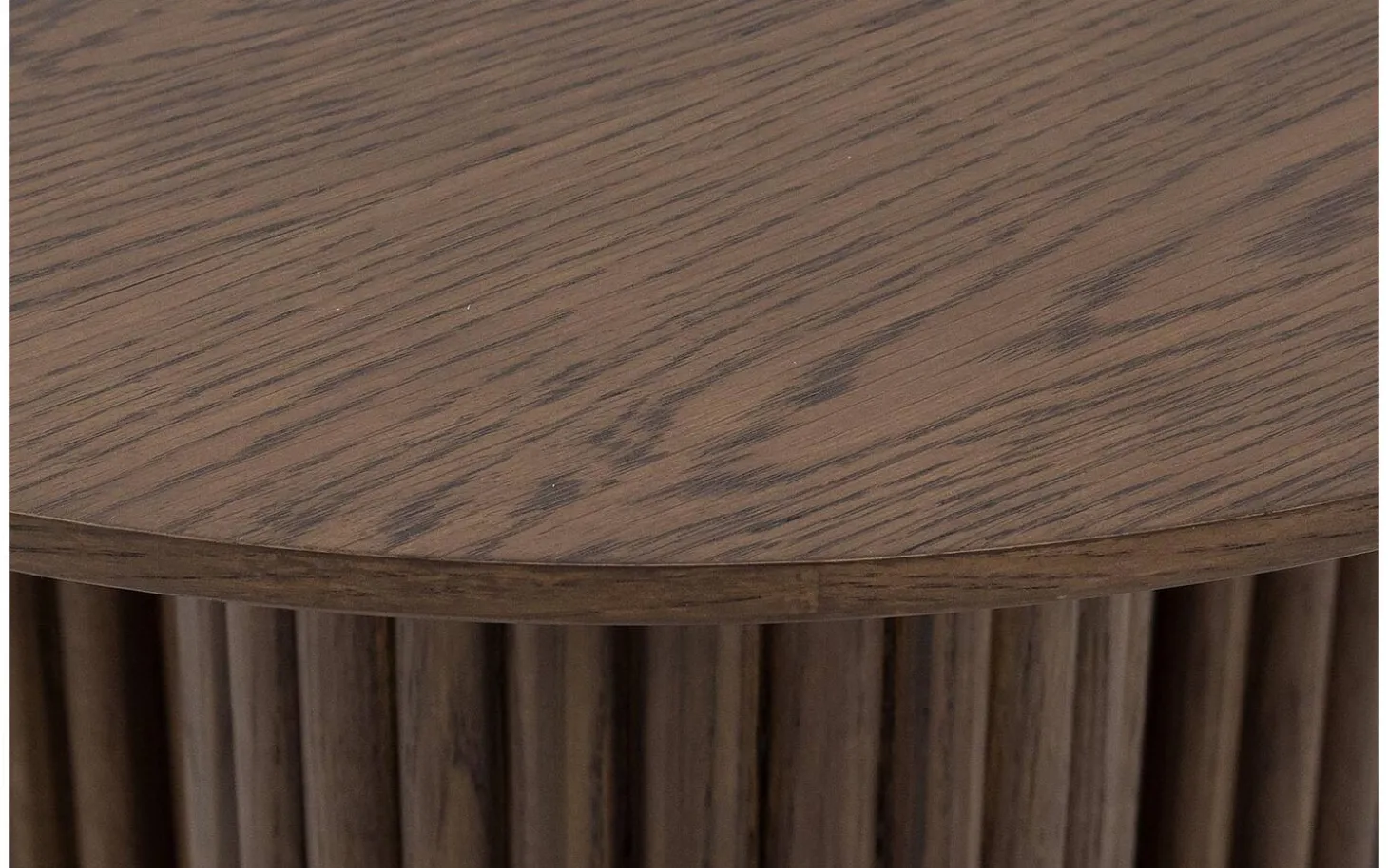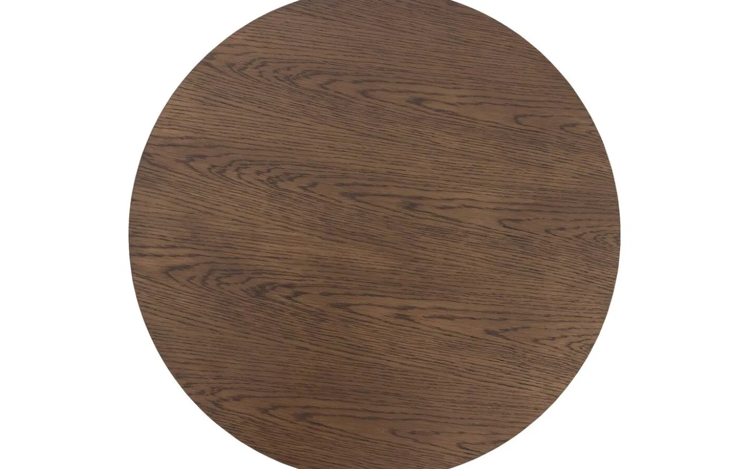Die runde Tischplatte ist aus Eichenfurnier in der Farbe Smoke gefertigt – einem warmen, neutralen Farbton, der zu allem passt. Die Soft Touch Lackierung bewahrt die natürliche matte Ausstrahlung und sorgt dafür, dass die Maserung sichtbar und fühlbar bleibt.