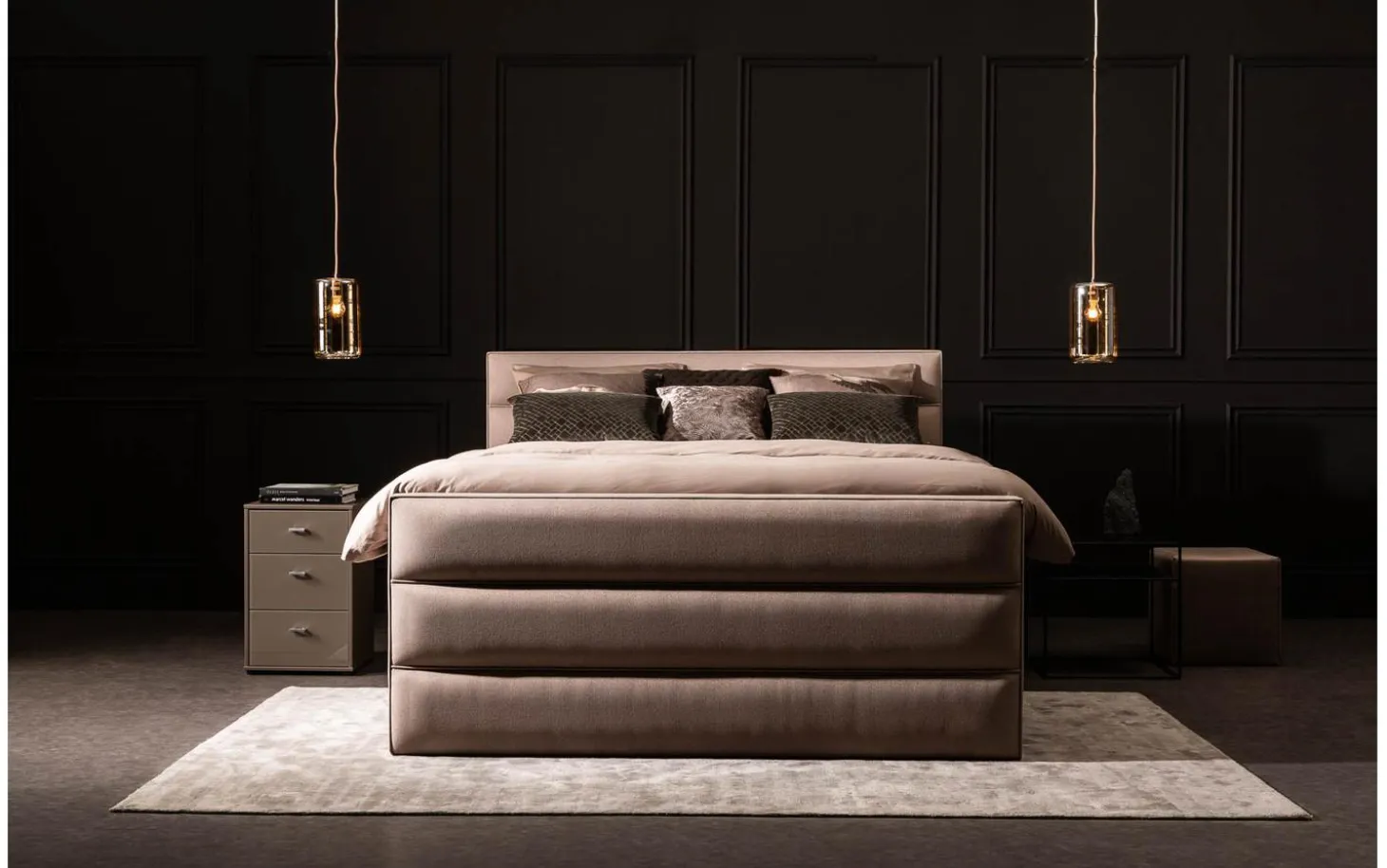 – 2 separaten Bodeneinsätzen für das Boxspringbett in der Farbe und mit dem Stoffbezug Ihrer Wahl