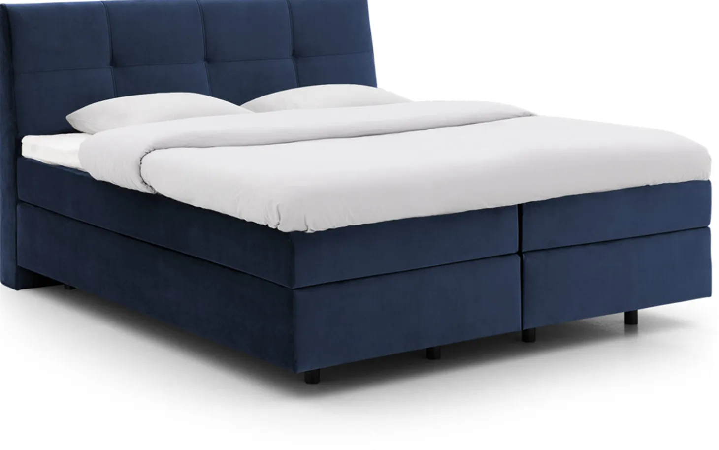 Das Boxspringbett Gusta ist ein anspruchsvolles Modell mit schickem Design und einem ansprechenden Bezug aus blaugrauem Samt. Die eleganten Nähte auf dem Kopfteil sorgen für eine stilvolle Note. Voll im Trend! Die schwarzen Füße sind 12 cm hoch, wodurch das Staubsaugen unter dem Bett zum Kinderspiel wird. In den Kern des Bettkastens ist eine solide Bonellfederung verarbeitet, die eine gute und stabile Basis für die Matratze bieten. Der Bettkasten ist ebenso wie der Kopfteil geradlinig verarbeitet und für ein ansprechendes Gesamtbild mit einem Bezug aus demselben fein gewebten Stoff versehen.