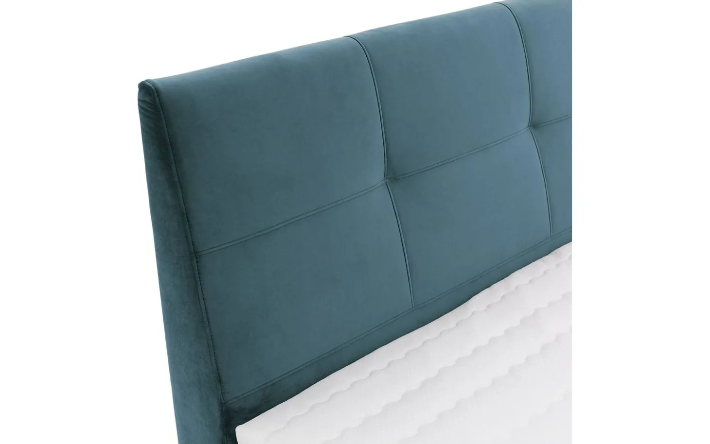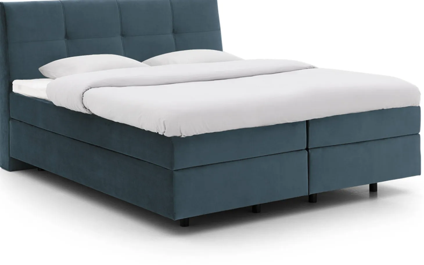 Das Boxspringbett Gusta ist ein anspruchsvolles Modell mit schickem Design und einem ansprechenden Bezug aus blaugrauem Samt. Die eleganten Nähte auf dem Kopfteil sorgen für eine stilvolle Note. Voll im Trend! Die schwarzen Füße sind 12 cm hoch, wodurch das Staubsaugen unter dem Bett zum Kinderspiel wird. In den Kern des Bettkastens ist eine solide Bonellfederung verarbeitet, die eine gute und stabile Basis für die Matratze bieten. Der Bettkasten ist ebenso wie der Kopfteil geradlinig verarbeitet und für ein ansprechendes Gesamtbild mit einem Bezug aus demselben fein gewebten Stoff versehen.