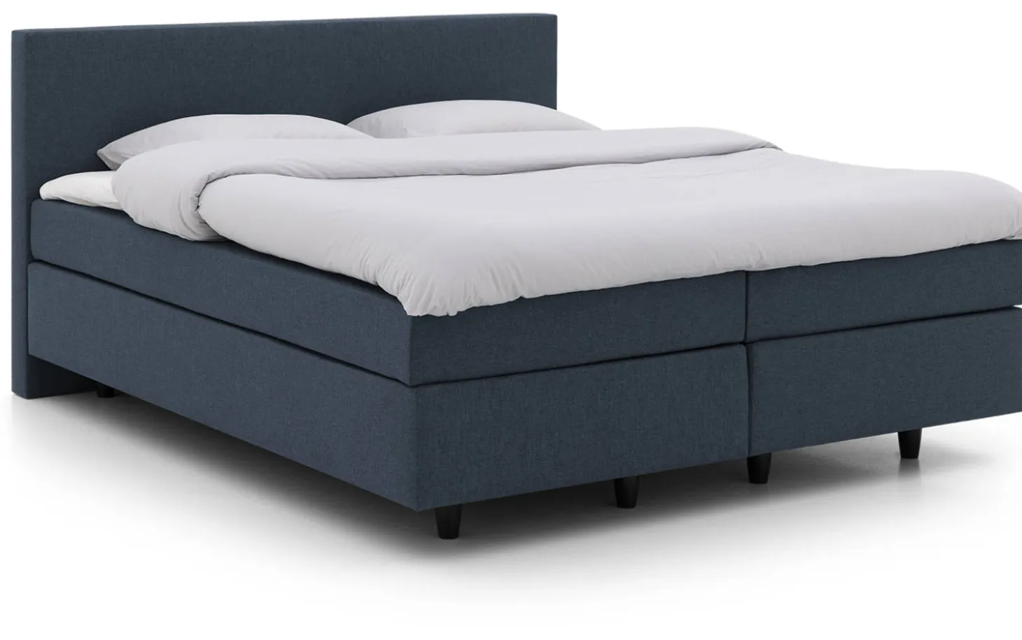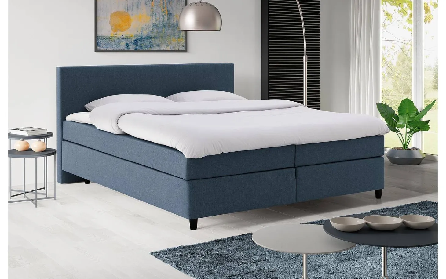Das Boxspringbett Iris besticht durch sein schlichtes, modernes Design, das sich durch klare Linien und eine luxuriöse, hochwertige Verarbeitung auszeichnet. Der Bezug aus einem fein gewebten Ferara-Stoff in Blau fühlt sich wunderbar weich an und ist leicht mit anderen Farben und Materialien kombinierbar. Daher passt dieses Prachtexemplar auch hervorragend in jedes Interieur. Das Boxspringbett hat 12 cm hohe schwarze Füße, wodurch das Staubsaugen unter dem Bett zum Kinderspiel wird. In den Kern des Bettkastens ist eine solide Bonellfederung verarbeitet, die eine gute und stabile Basis für die Matratze bieten. Der Bettkasten ist ebenso wie der Kopfteil geradlinig verarbeitet und für ein ansprechendes Gesamtbild mit einem Bezug aus demselben fein gewebten Stoff versehen.
