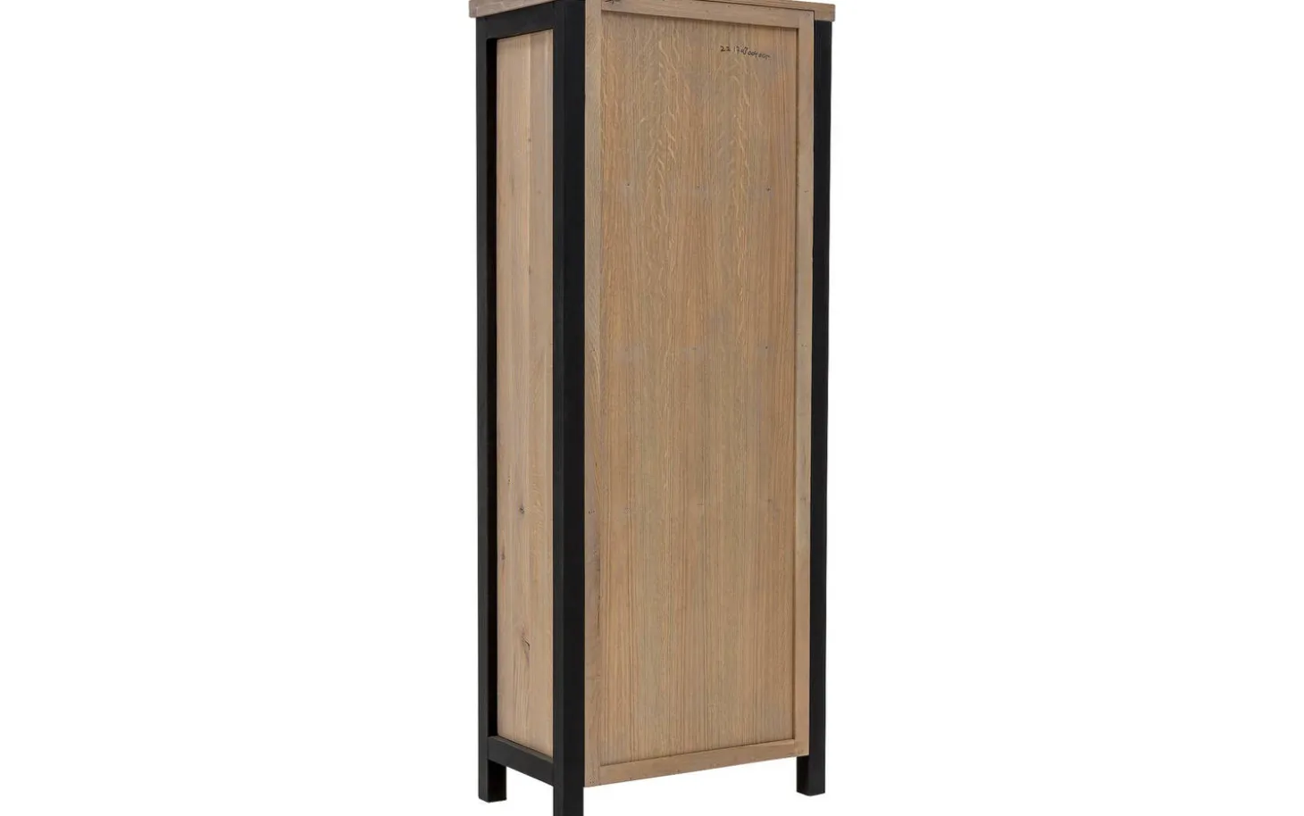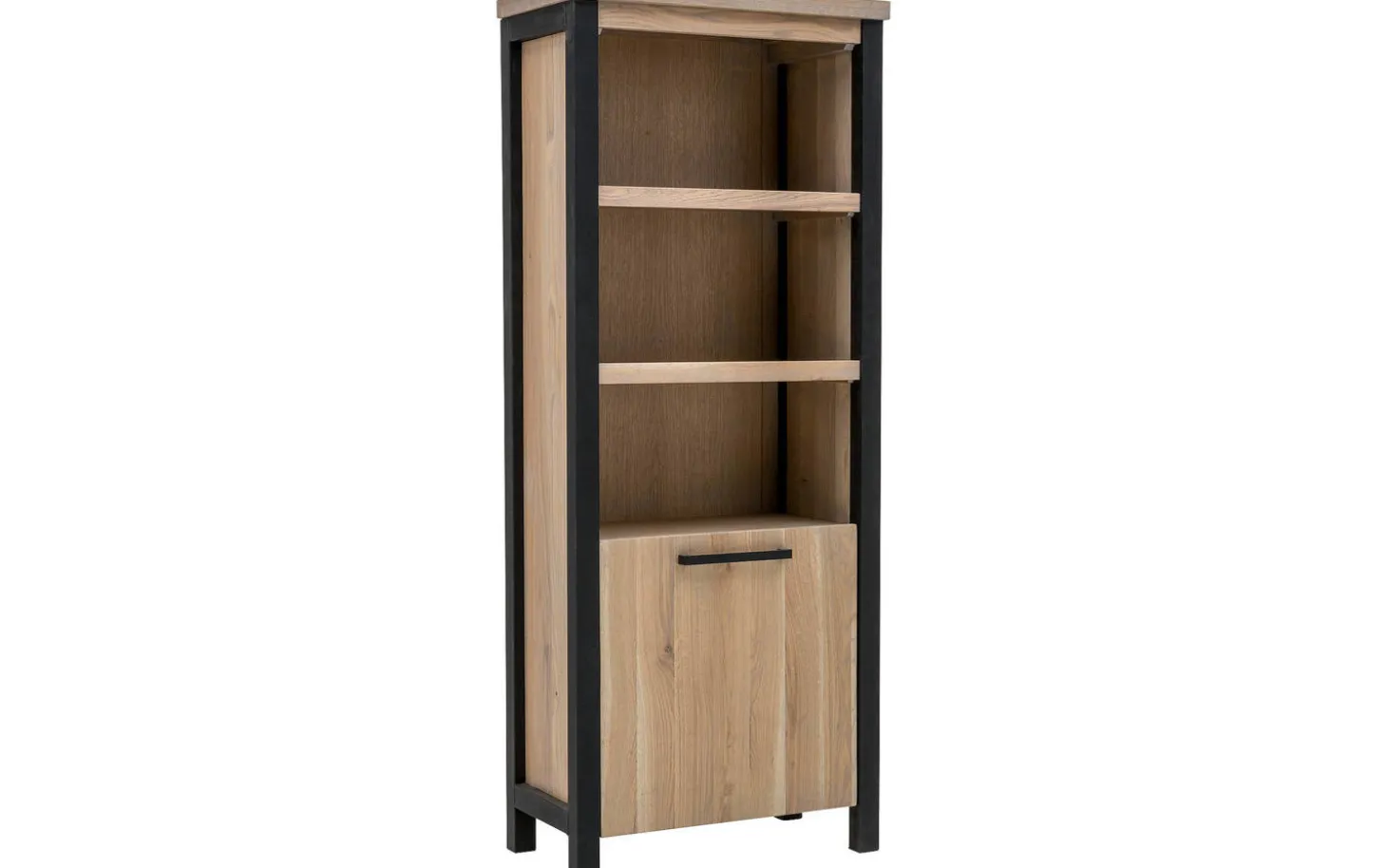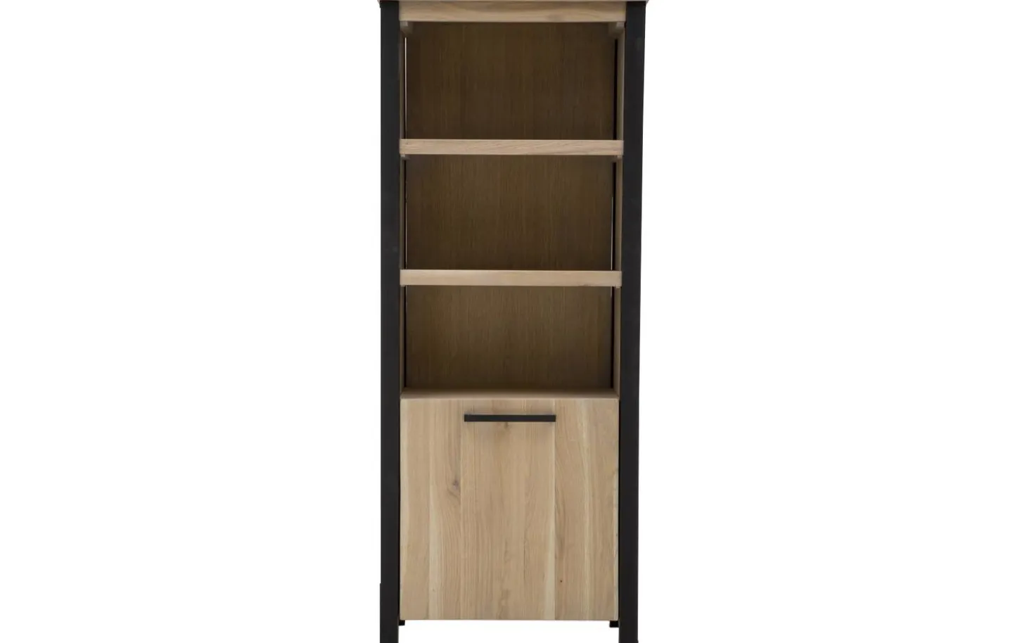 Das Eichenholz ist mit Öl behandelt, wodurch die natürlichen Farbschattierungen und Maserungen wunderschön zur Geltung kommen. Der schwarze Metallgriff und die Füße sorgen für einen eleganten Kontrast zum warmen Holz. Durch das langlebige Material können Sie jahrelang Freude an diesem robusten Bücherregal haben.