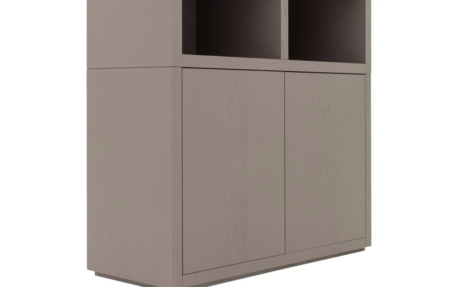 Die kraftvollen Linien des Büffetschranks Barcelona werden durch das taupe lackierte Eichenfurnier verstärkt. Die schützende Lackschicht bietet nicht nur eine elegante Ausstrahlung, sondern schützt auch effektiv vor Flecken und Ringen. Eine praktische Schönheit für den täglichen Gebrauch.