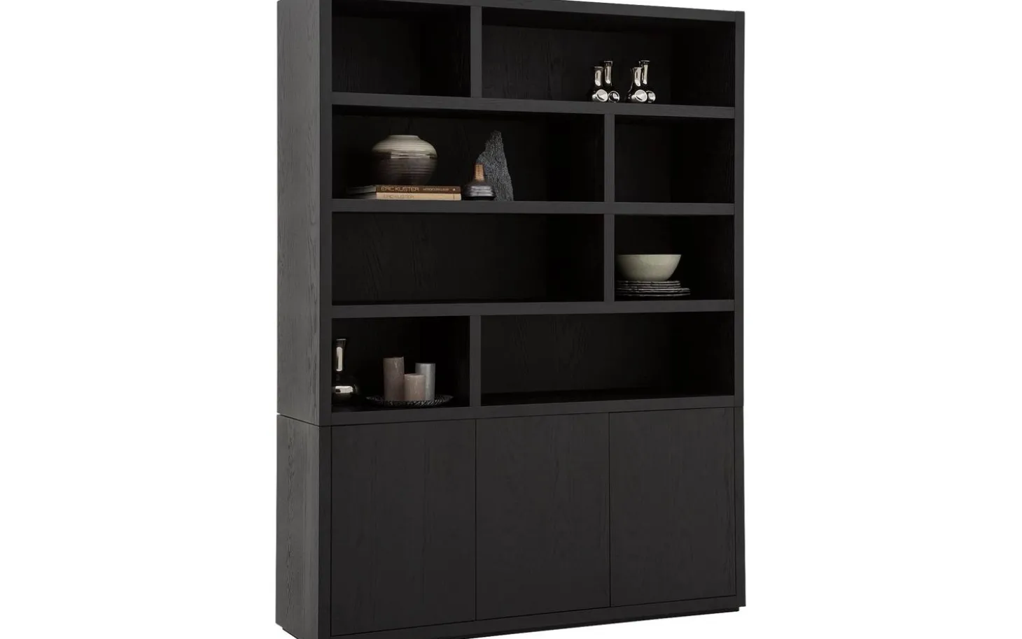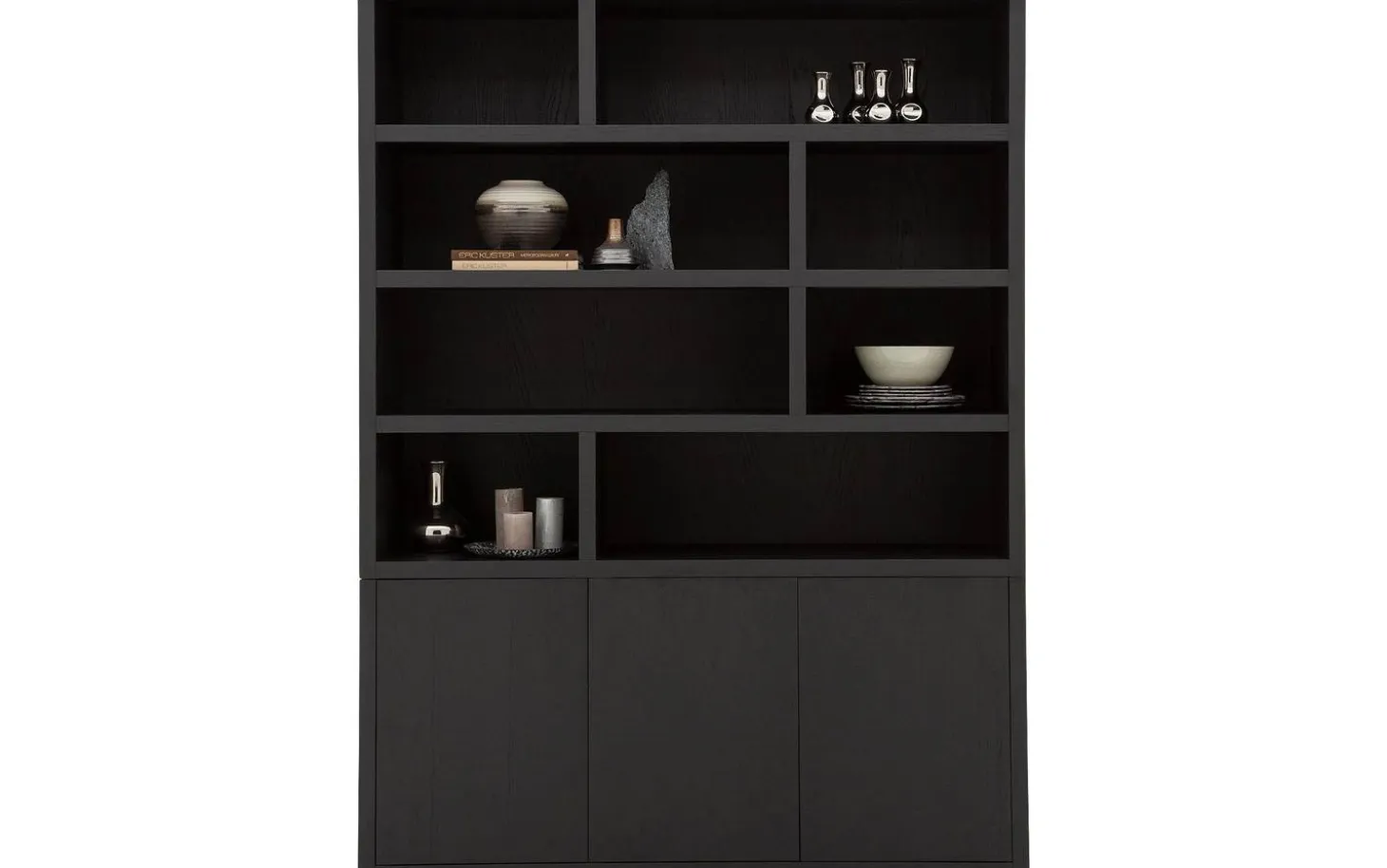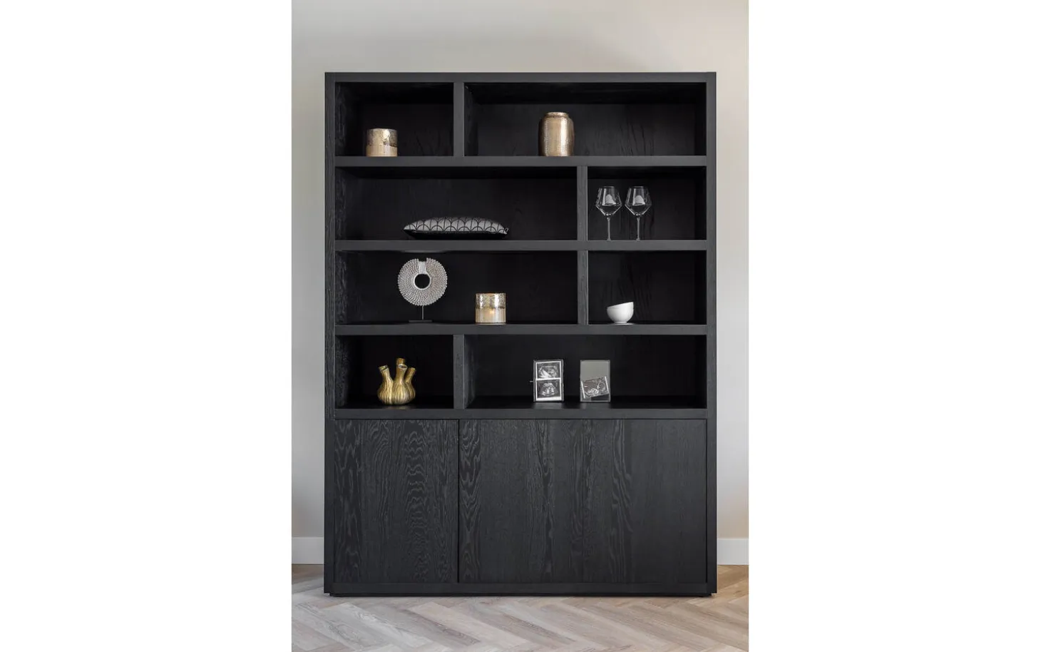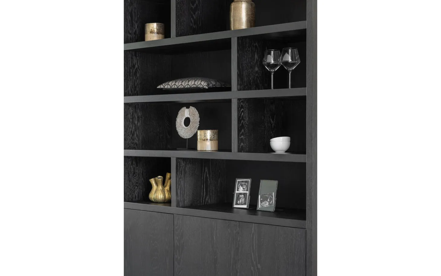 Kreieren Sie Ihren persönlichen Stil mit dekorativen Wohnaccessoires in den offenen Fächern. Geschirr, Bilderrahmen oder Designobjekte kommen wunderbar zur Geltung vor dem schwarzen Hintergrund. Der geschlossene Stauraum sorgt gleichzeitig für eine ruhige, aufgeräumte Ausstrahlung.