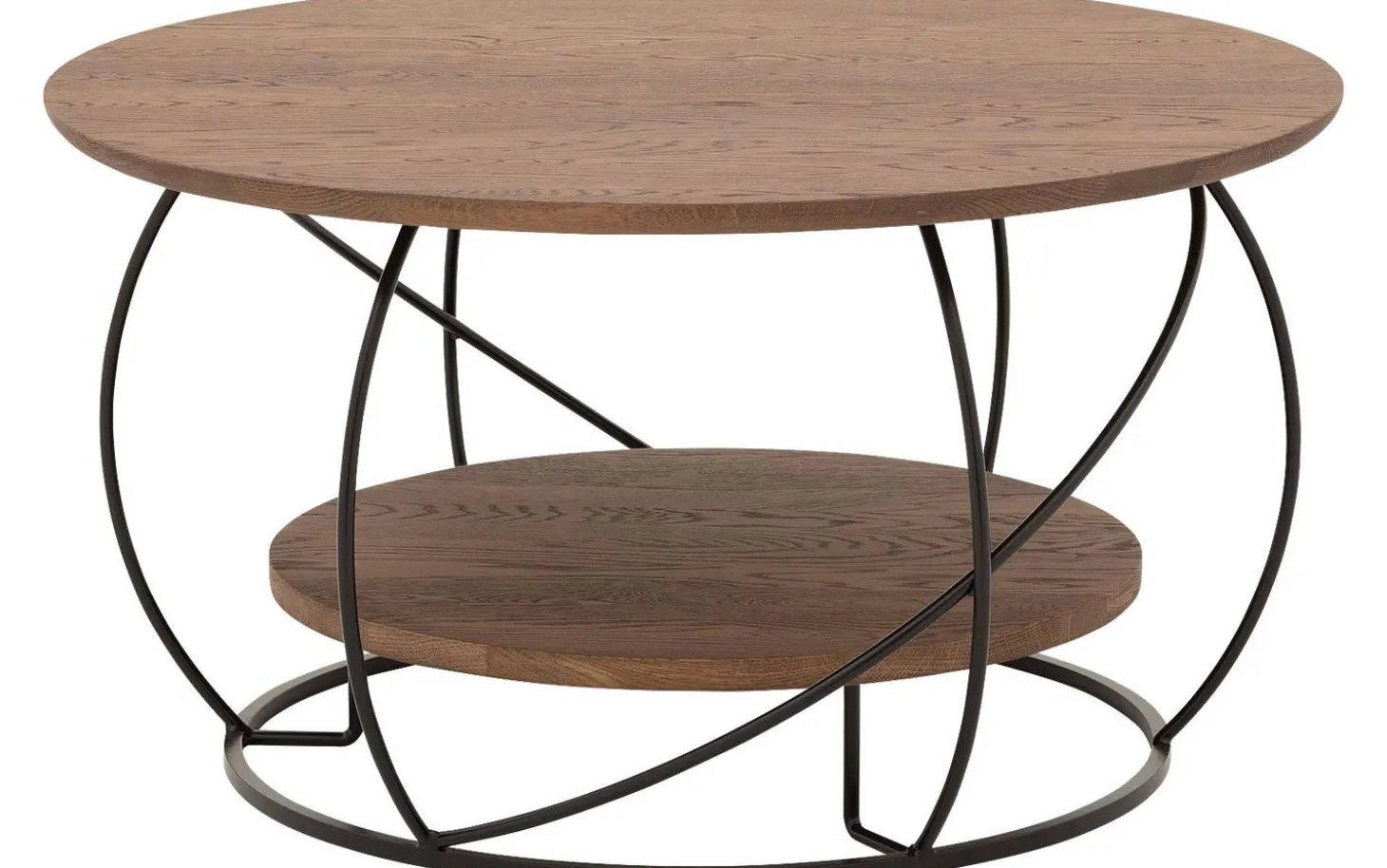Der runde Couchtisch Bellis aus Eichenholz bringt Wärme in Ihr Wohnzimmer. Dieser Eichenholz-Couchtisch mit organischen Formen ist ein echter Blickfang. Die doppelte Platte in Nussbaumton und das schwarze Metallgestell sorgen für eine stilvolle ländliche Ausstrahlung, die Ihren Raum sofort gemütlicher macht.