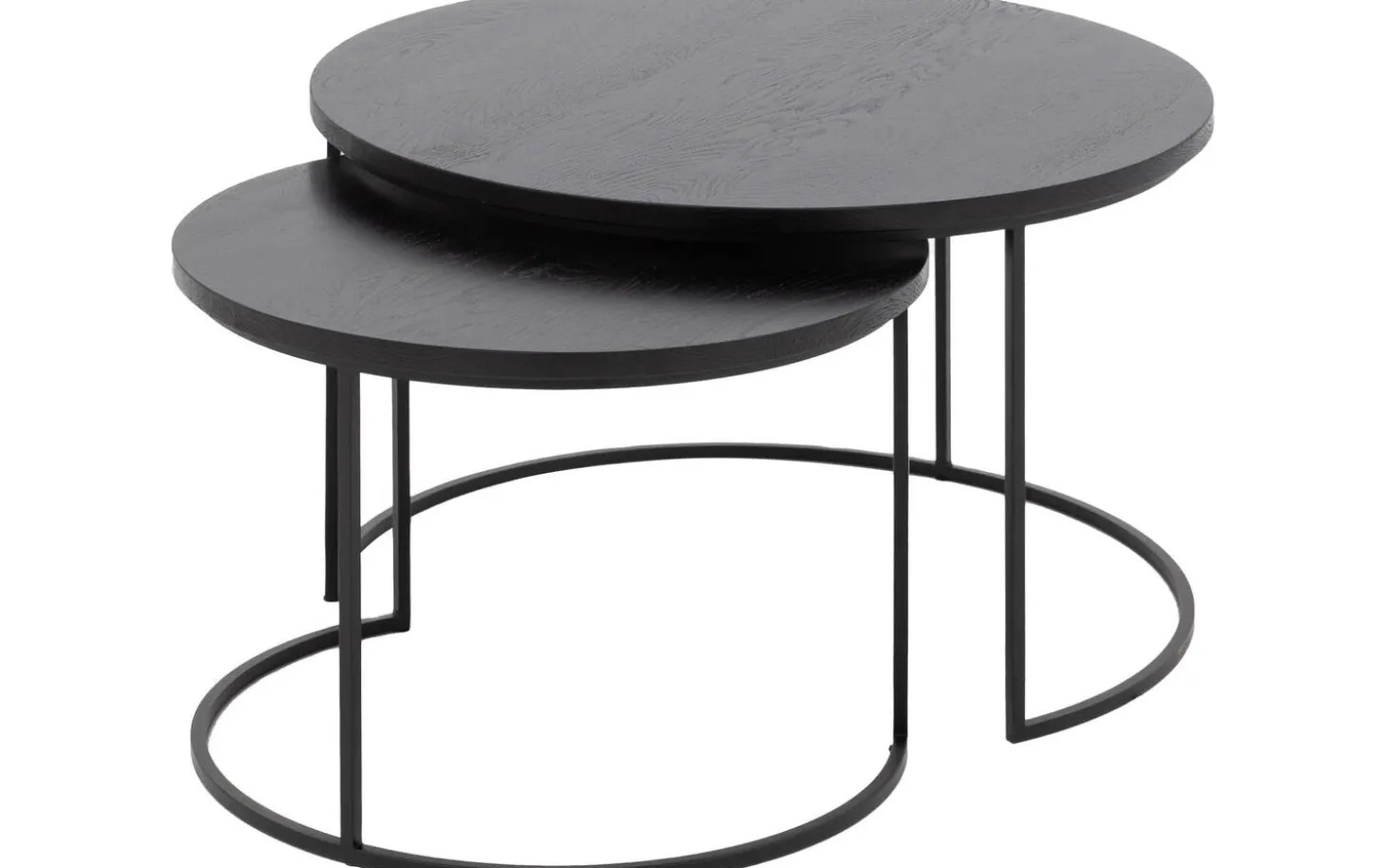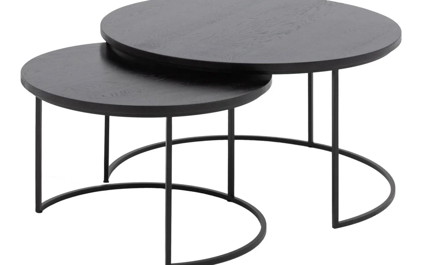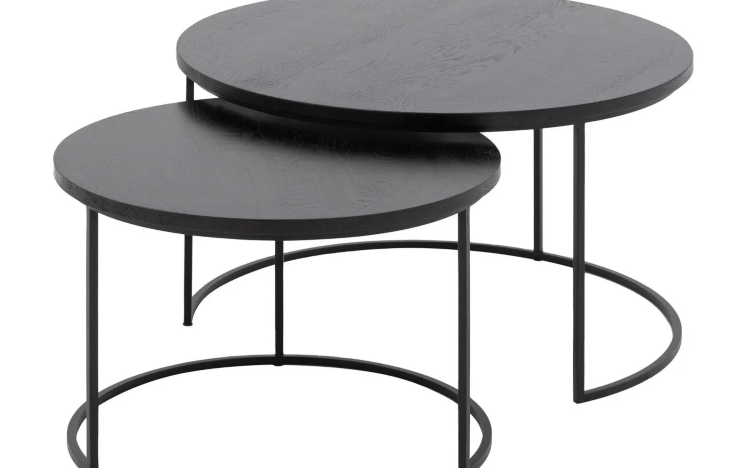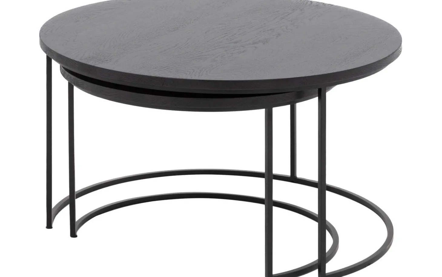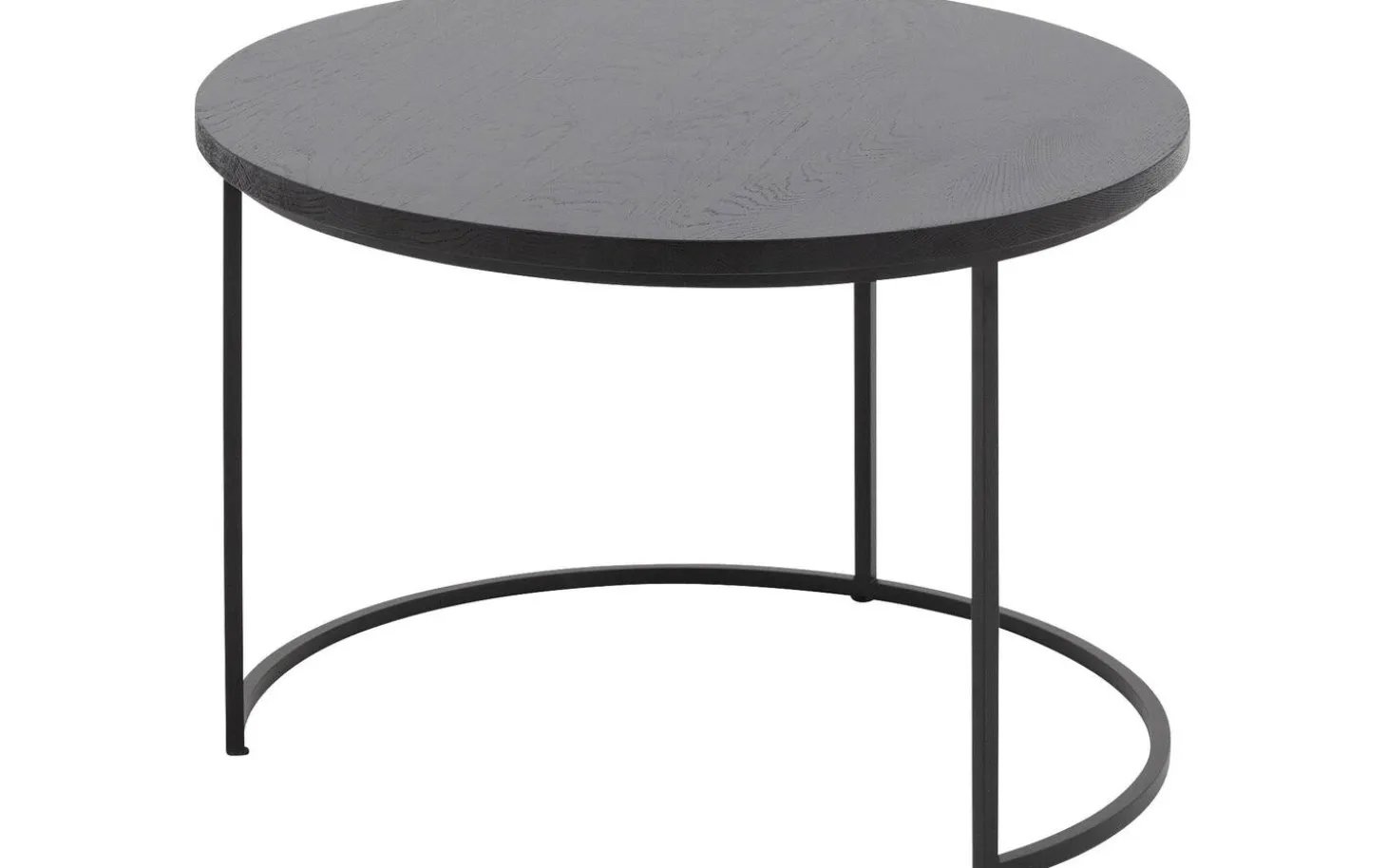 Salontafel Iras heeft een ronde vorm die zachtheid brengt in je interieur. De ronde poten van zwart metaal geven de tafels een subtiele en moderne uitstraling die mooi contrasteert met het warme eikenhout.