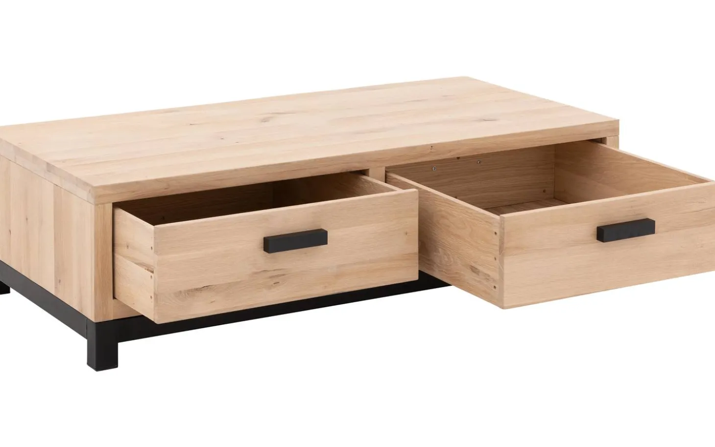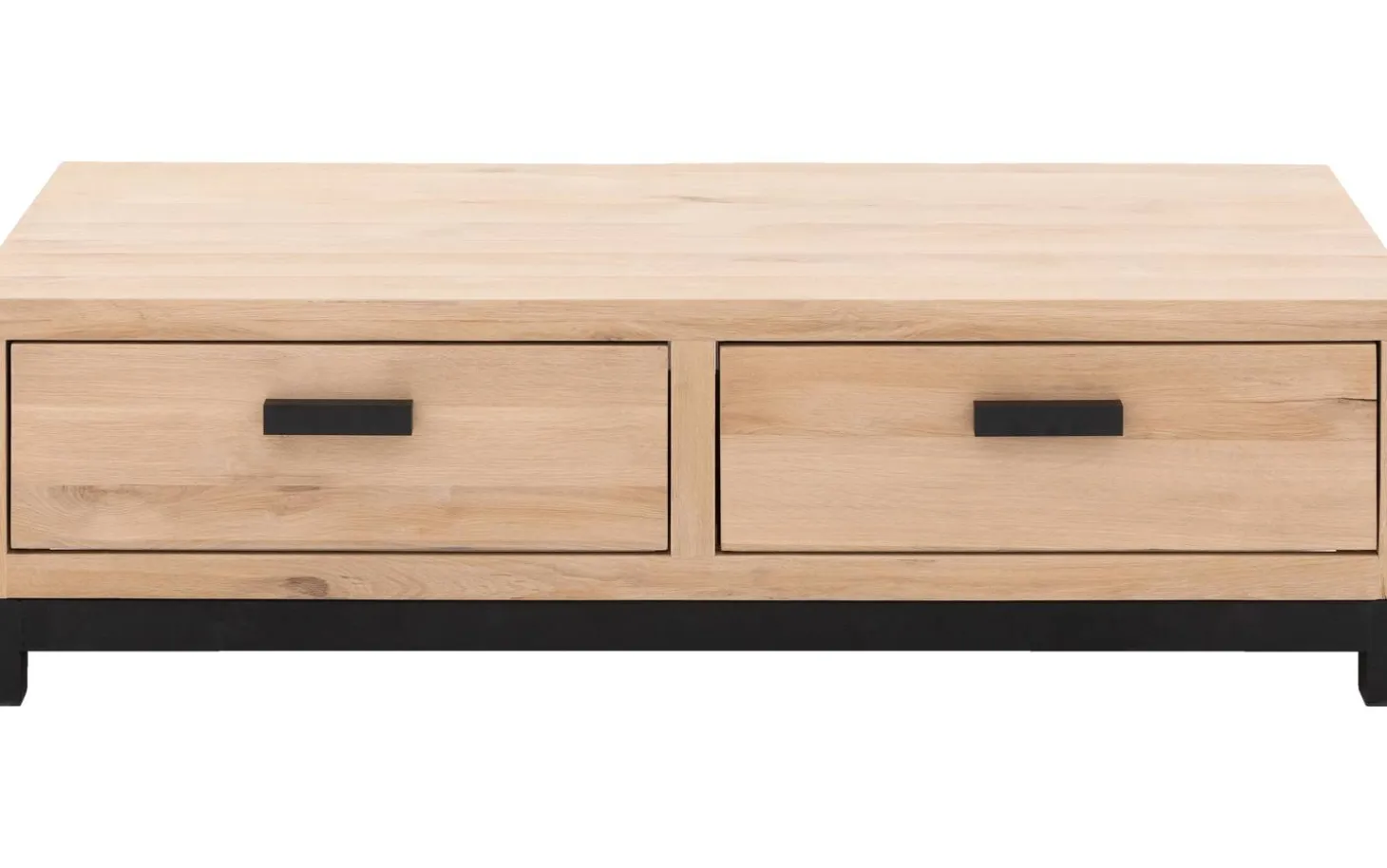 Verleihen Sie Ihrem Wohnzimmer eine natürliche Ausstrahlung mit dem rechteckigen Couchtisch Sans. Dieser Couchtisch aus hellem Eichenholz ist aus Eichenholz gefertigt und dadurch sehr stabil. Das Metallgestell mit quadratischen Beinen verleiht Sans eine robuste Note. Dank der zwei praktischen Schubladen können Sie all Ihre TV-Utensilien und kleine Gegenstände ordentlich verstauen.