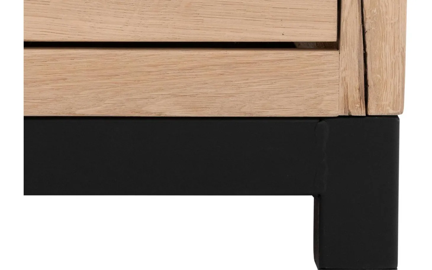 Das schwarze Metallgestell mit quadratischen Beinen verleiht Sans eine industrielle Note. Die Kombination aus warmem Holz und kühlem Metall sorgt für eine perfekte Balance zwischen robust und gemütlich in Ihrem Wohnraum.