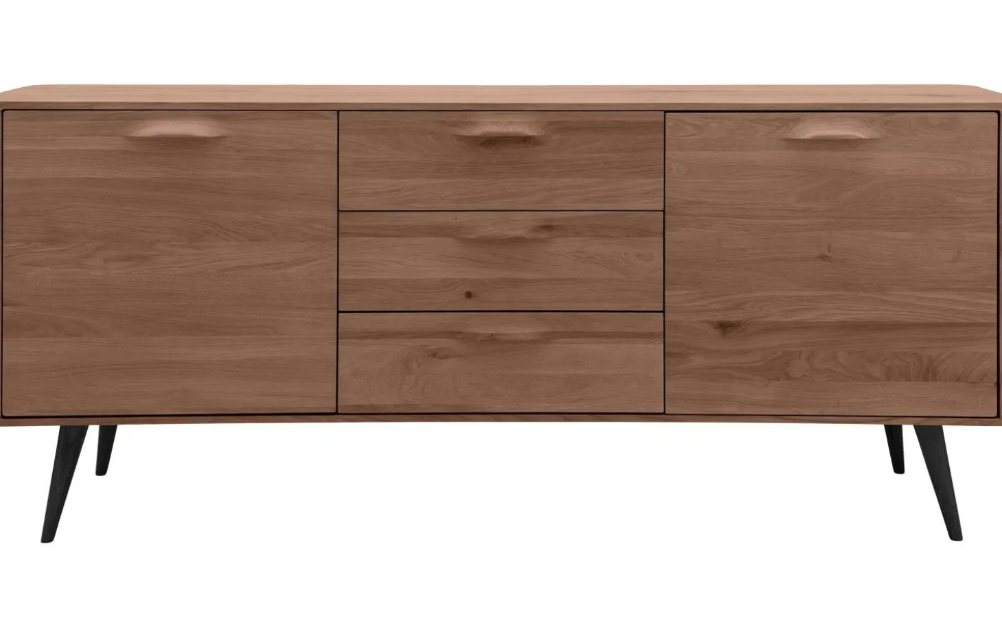 Sideboard Bjarte kombiniert Retro-Charme mit praktischem Stauraum für Ihr Wohnzimmer. Die runden, weit ausladenden Beine verleihen diesem Eichen-Sideboard eine trendige Vintage-Ausstrahlung, während die 2 Türen und 3 Schubladen mit Soft-Close-System für stilvolle Aufbewahrung sorgen. Perfekt, um Ihre liebsten Wohnaccessoires zur Geltung zu bringen und gleichzeitig alles ordentlich zu verstauen.