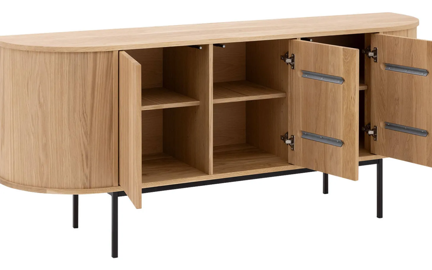 Der natürliche Eichen-Soft-Touch-Lack betont die warme Holzstruktur und sorgt für eine sanfte, matte Oberfläche. Die Kombination aus massivem Eichenholz und Eichen-Furnier lässt die charakteristischen Rundungen von Delfina wunderschön zur Geltung kommen. Mit einem großzügigen Format von 191 x 80 x 46 cm bietet dieses Sideboard reichlich Stauraum.