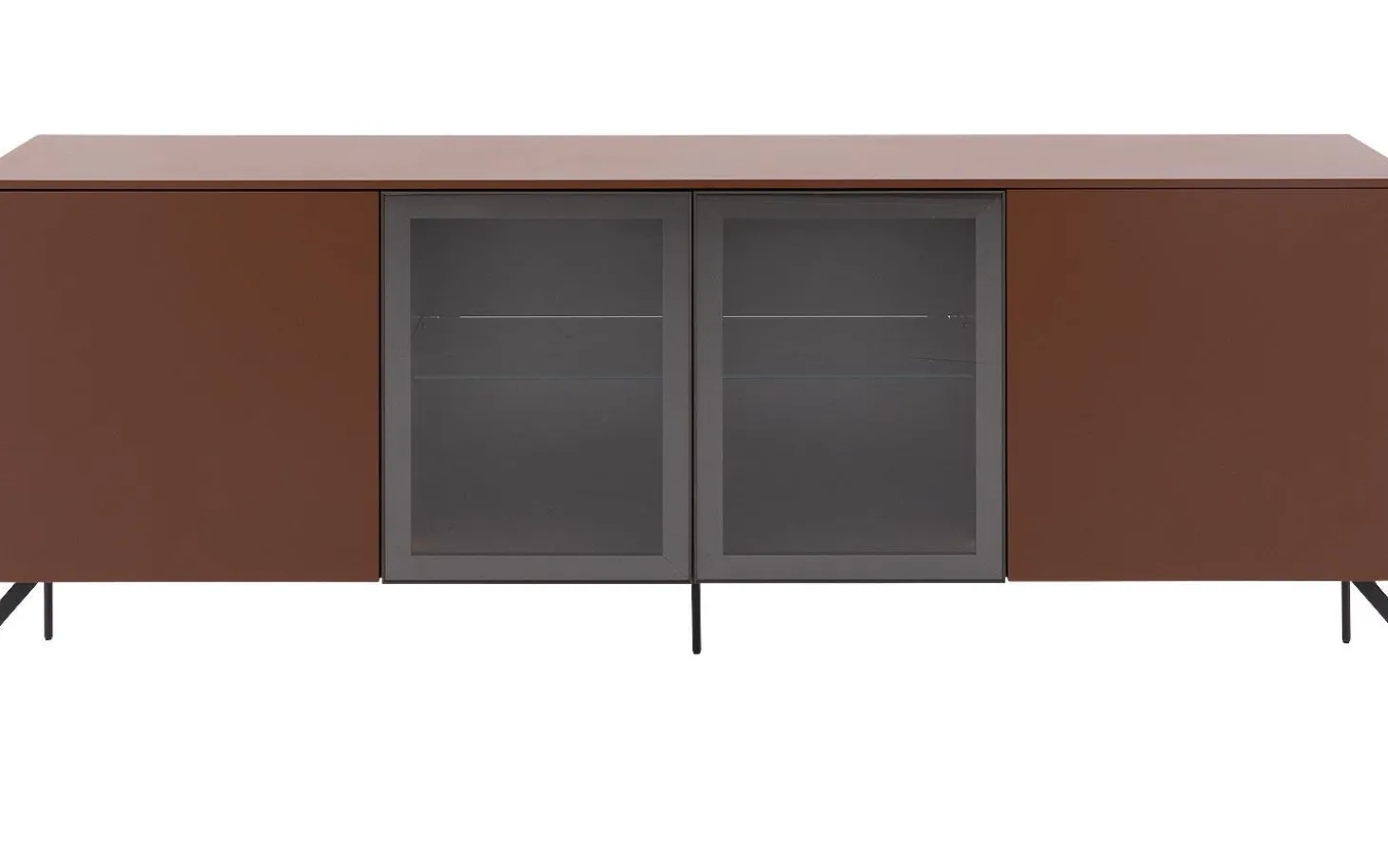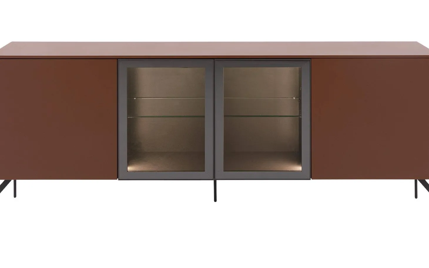 Die rostbraune Farbe des Sideboards Fame passt perfekt sowohl in moderne als auch klassische Interieurs. Das MDF ist mit einem Seidenglanslack veredelt, der nicht nur schön aussieht, sondern auch vor täglichem Verschleiß schützt. Die Glastüren geben Ihnen die Möglichkeit, dekorative Objekte schön sichtbar zu platzieren.