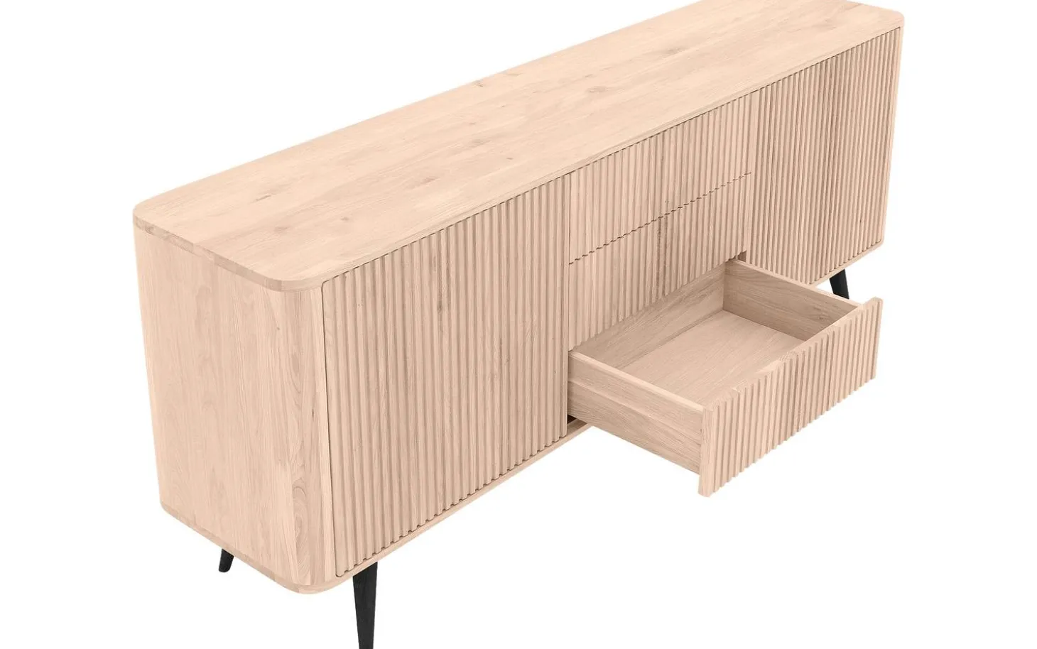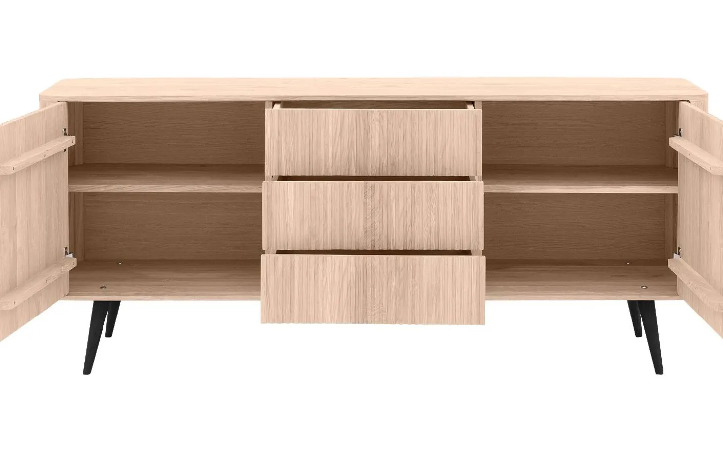 Die lackierte Oberfläche schützt das langlebige Eichenholz wirkungsvoll vor täglicher Beanspruchung. Das Push-to-Open-System öffnet Türen und Schubladen mit leichtem Druck, wodurch die klaren Linien erhalten bleiben. Die geräumigen Fächer (59 x 22 x 35 cm) und praktischen Schubladen (50 x 11 x 36 cm) bieten reichlich Stauraum.