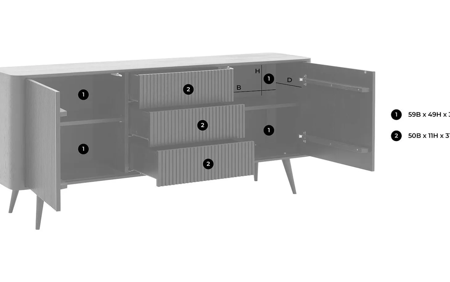 Die beiden geschlossenen Fächer haben verstellbare Böden, sodass Sie die Einteilung ganz nach Wunsch anpassen können. Ob Sie nun Geschirr, Spiele oder andere wichtige Gegenstände aufbewahren – alles hat seinen eigenen Platz. Das Push-to-Open-System macht die Bedienung besonders einfach.