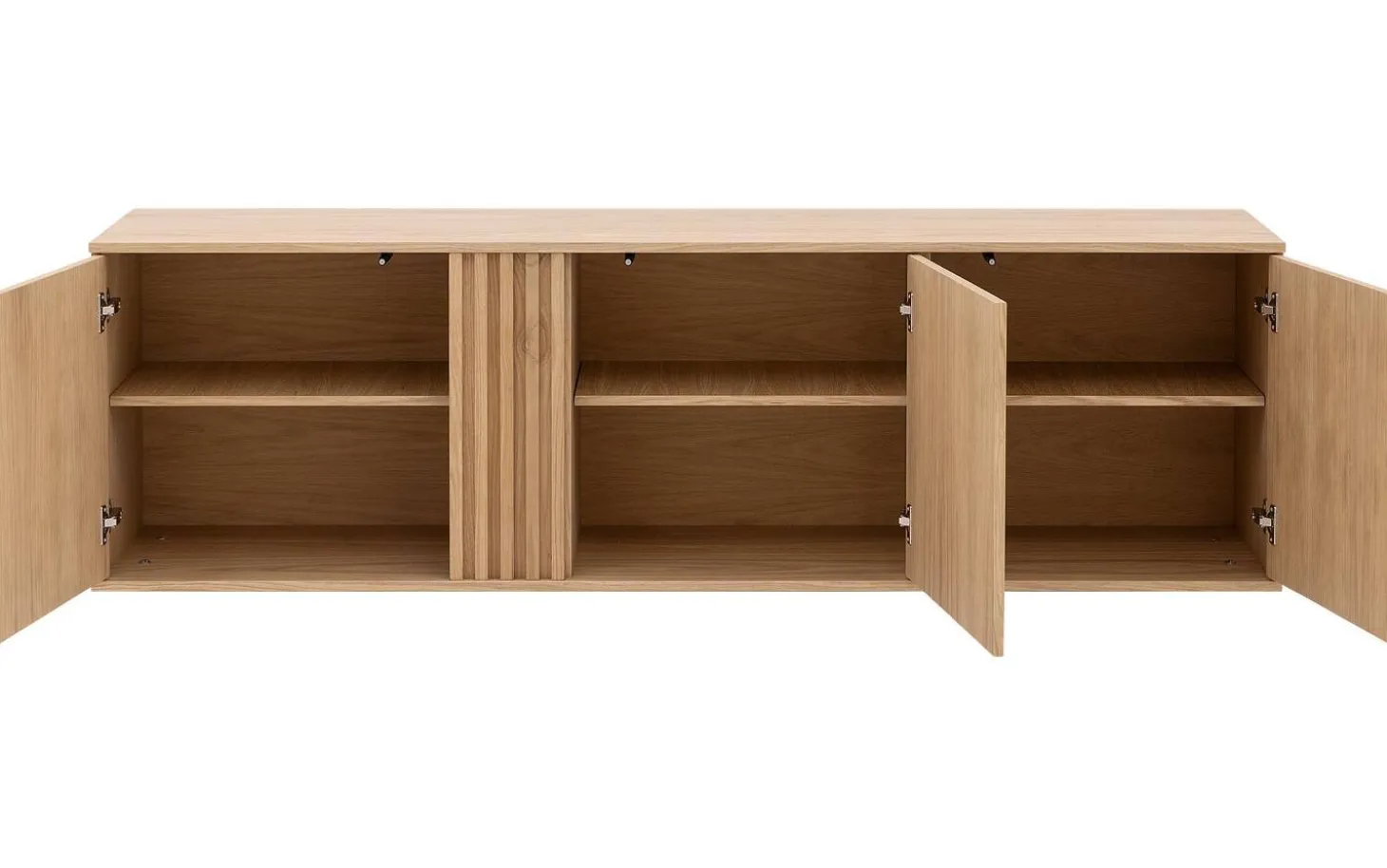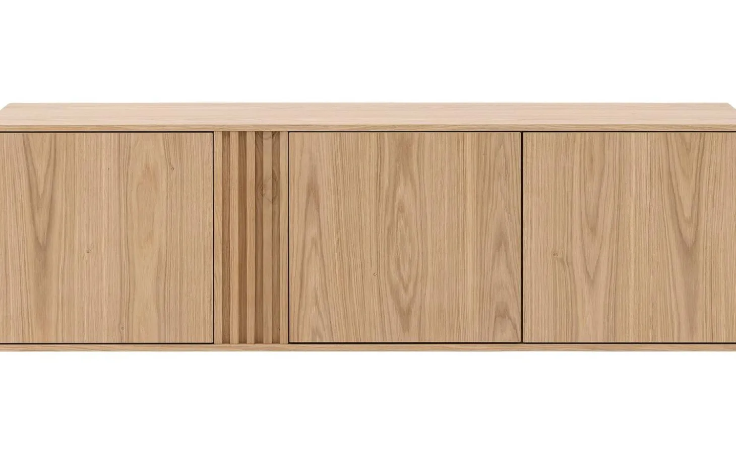 Dieses Eichen-Sideboard strahlt moderne Eleganz durch seine klare Formgebung und warme Holzoptik aus. Die blanke Lackierung betont die natürliche Holzstruktur und verleiht Ihrem Interieur eine frische, helle Ausstrahlung. Durch die hängende Aufstellung wirkt Ihr Raum größer und Sie schaffen einen schwebenden Effekt.