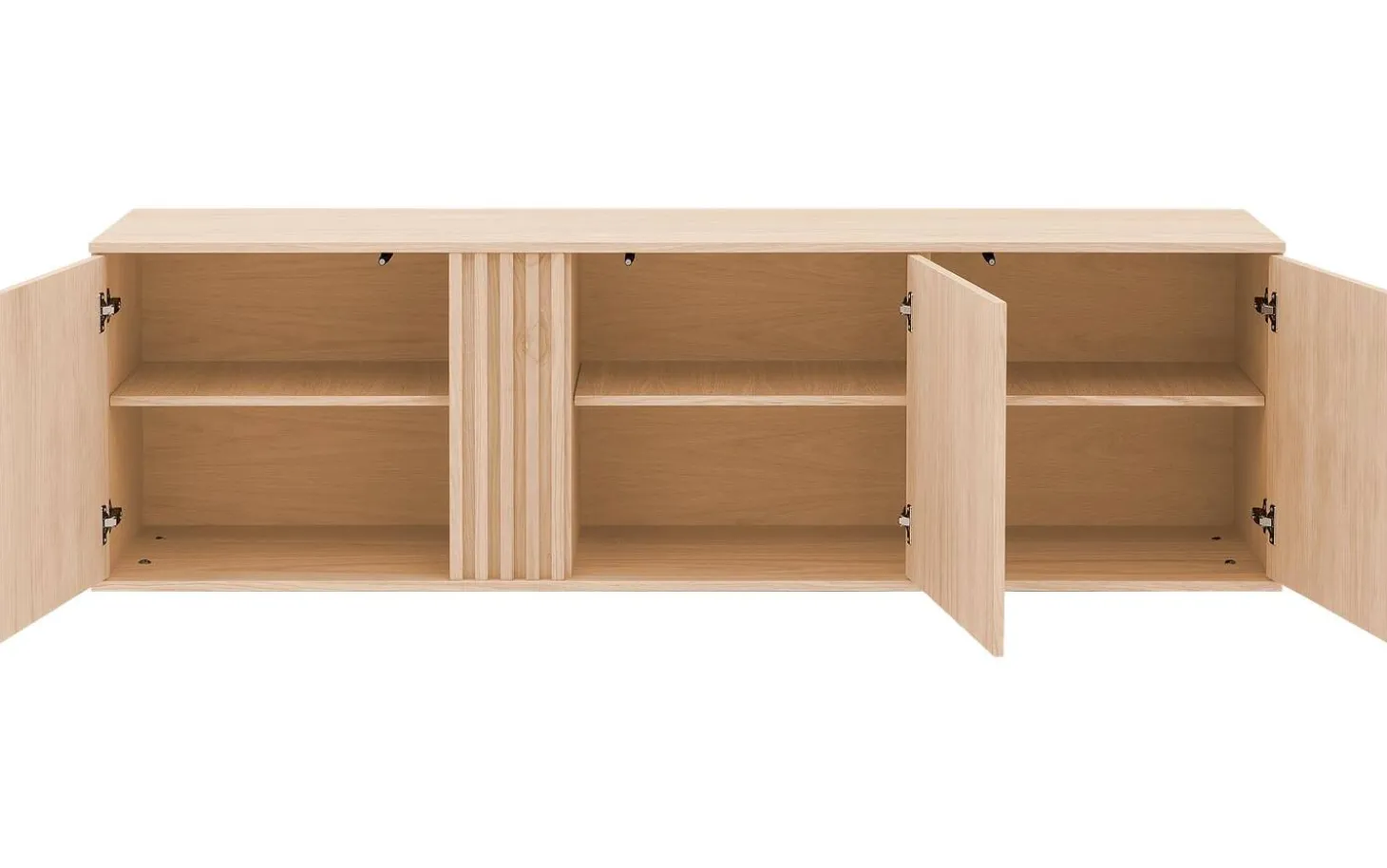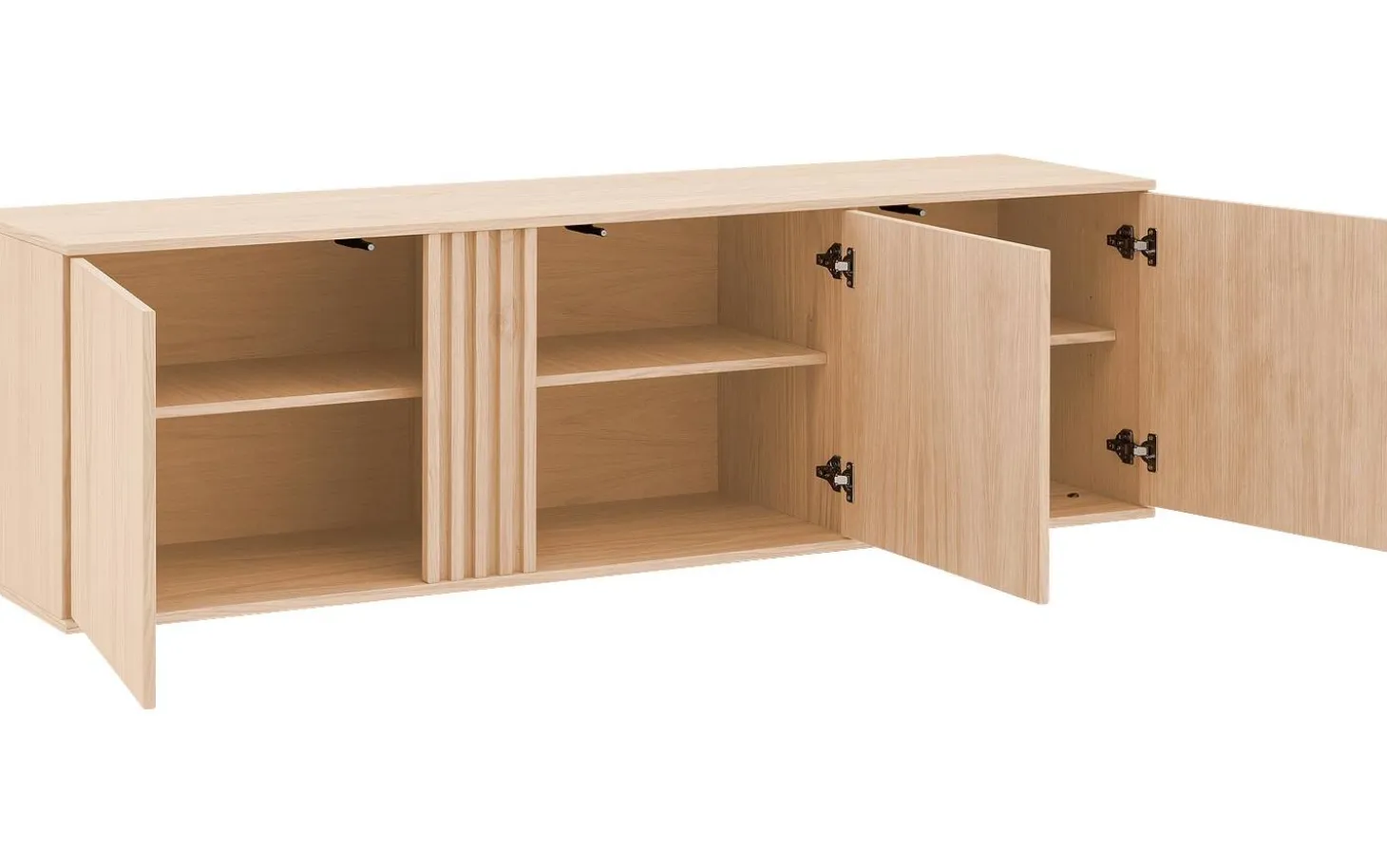 Dieses weiße Eichen-Sideboard Viola bringt Ruhe und Eleganz in Ihr Interieur. Die klaren Linien und modernen schwarzen Metallbeine sorgen für eine zeitlose Ausstrahlung, die in jeden Raum passt. Mit dem praktischen Push-to-Open-System öffnen Sie Türen und Schubladen mühelos – ohne Griffe für ein klares Design.
