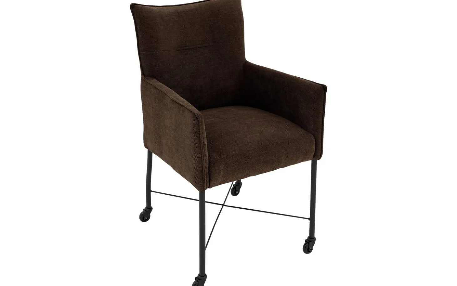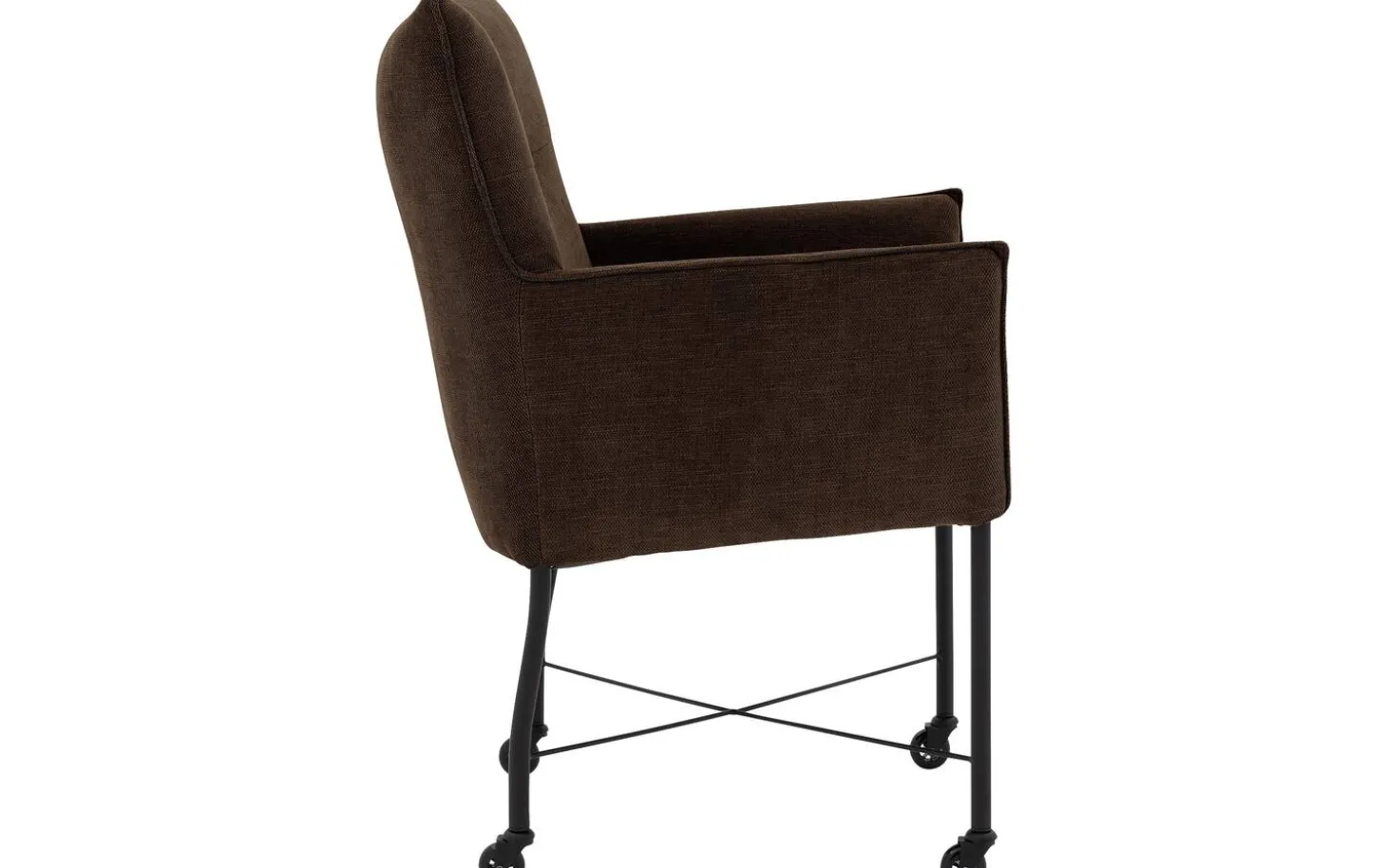 Der braune Esszimmerstuhl Erik mit Armlehne bietet Komfort und Stil in einem. Dieser fein gewebte Stuhl aus Stoff passt dank seiner vielseitigen Ausstrahlung perfekt zu jedem Esstisch. Die praktischen schwarzen Rollen sorgen dafür, dass Sie leicht an den Tisch heranrücken oder aufstehen können, ideal während eines gemütlichen Essens oder einer Geburtstagsfeier. Das moderne Design des Esszimmerstuhls Erik macht ihn zu einem echten Blickfang in Ihrem Esszimmer.