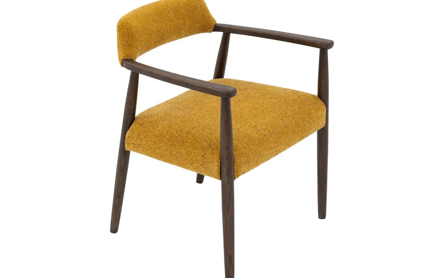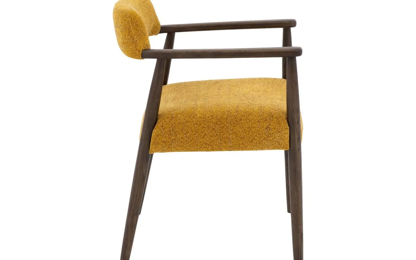 Die dunkel cognacfarbenen lackierten Eschenbeine bieten eine stabile Basis und bilden einen schönen Kontrast zum gelben Stoff. Mit einer Sitzhöhe von 46 cm passt dieser Stuhl perfekt zu den meisten Esstischen. Die Armlehnen machen das Sitzen besonders komfortabel, vor allem bei längeren Mahlzeiten.
