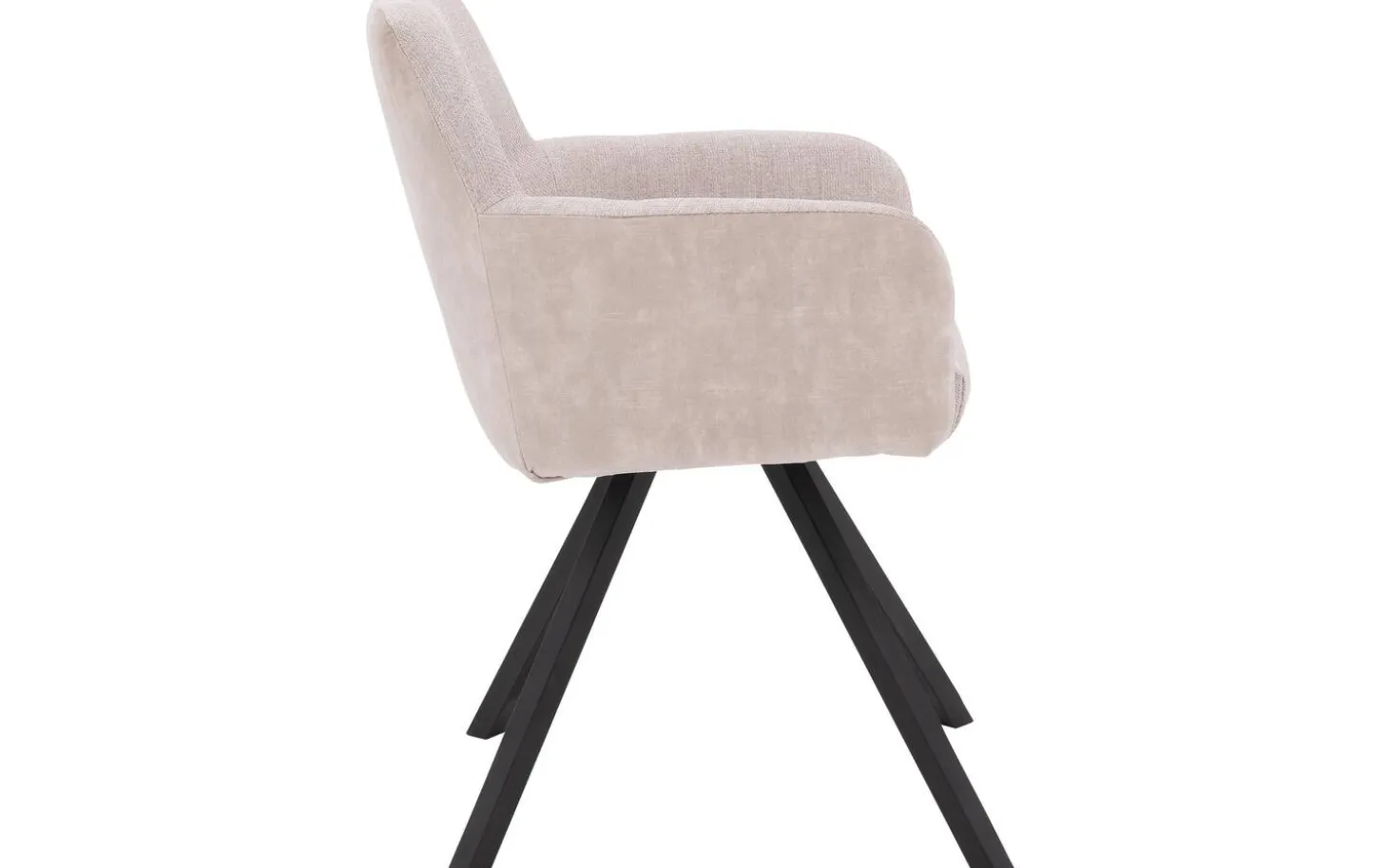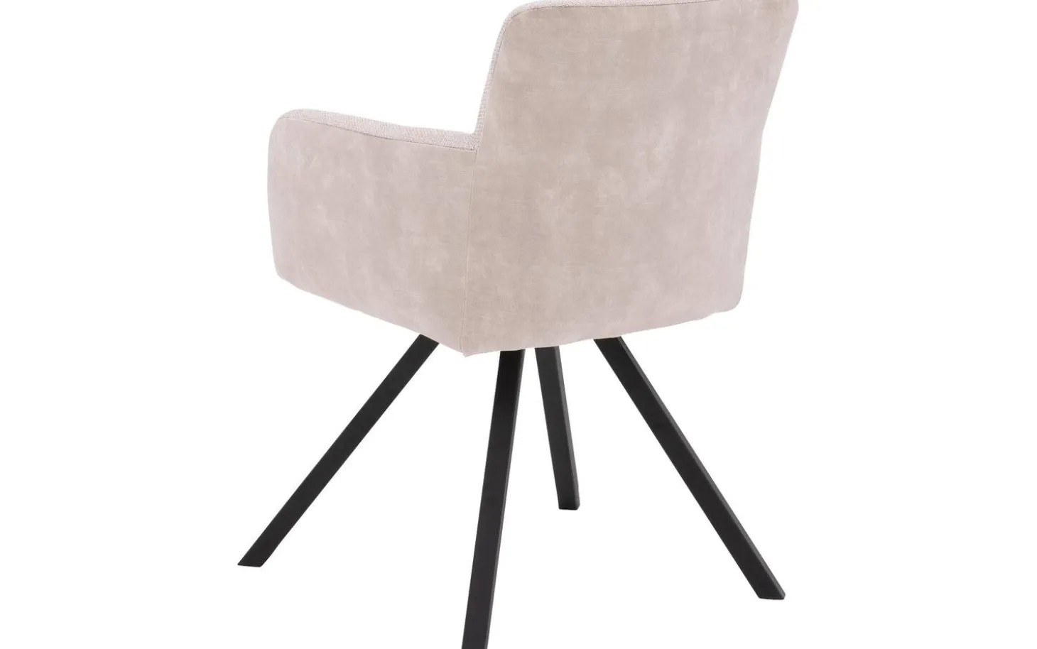 Der melierte grob gewebte Stoff im Naturton verleiht dem Esszimmerstuhl Jesse eine warme und rustikale Ausstrahlung. Diese Polsterung wird durch den Velourstoff an der Rückenlehne schön akzentuiert, was nicht nur ein angenehmes Gefühl bietet, sondern auch einen stilvollen visuellen Kontrast erzeugt.
