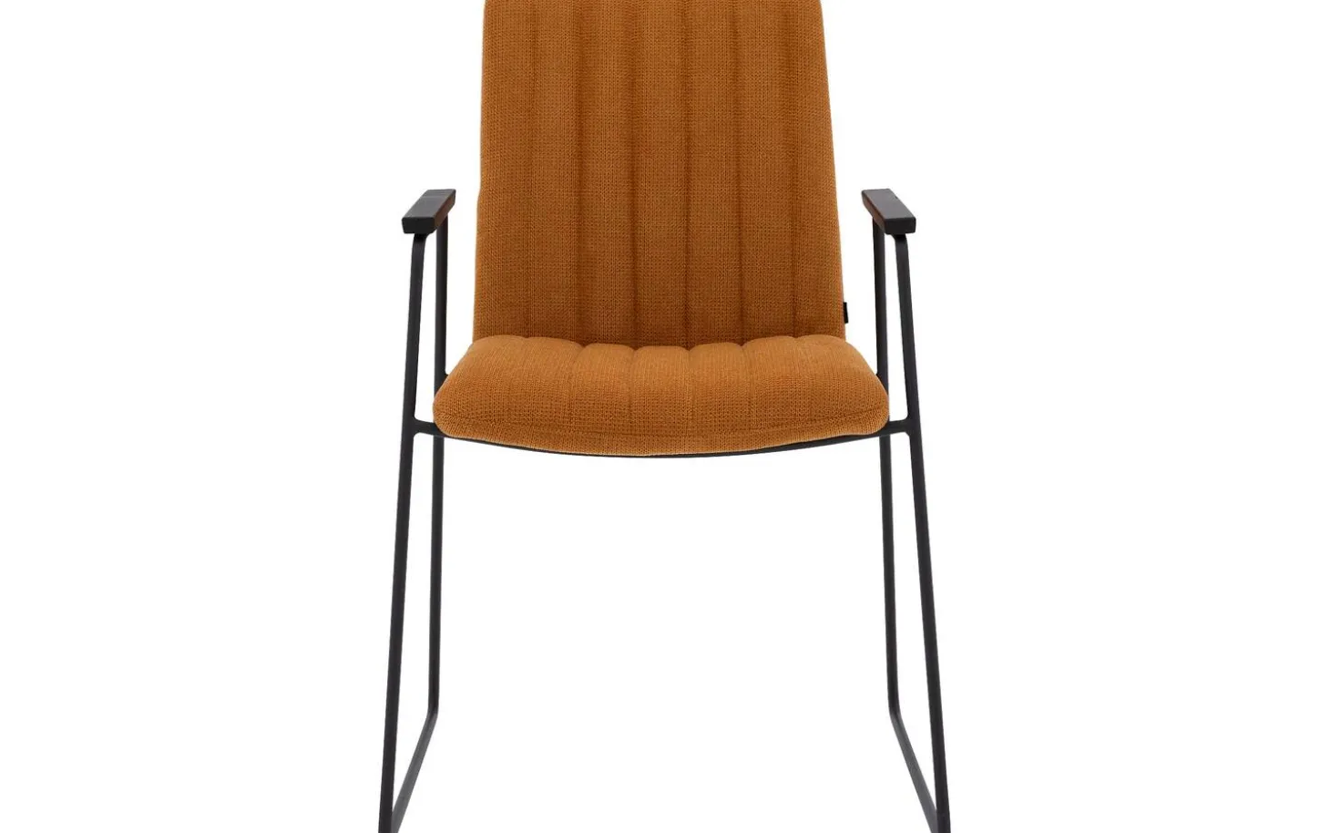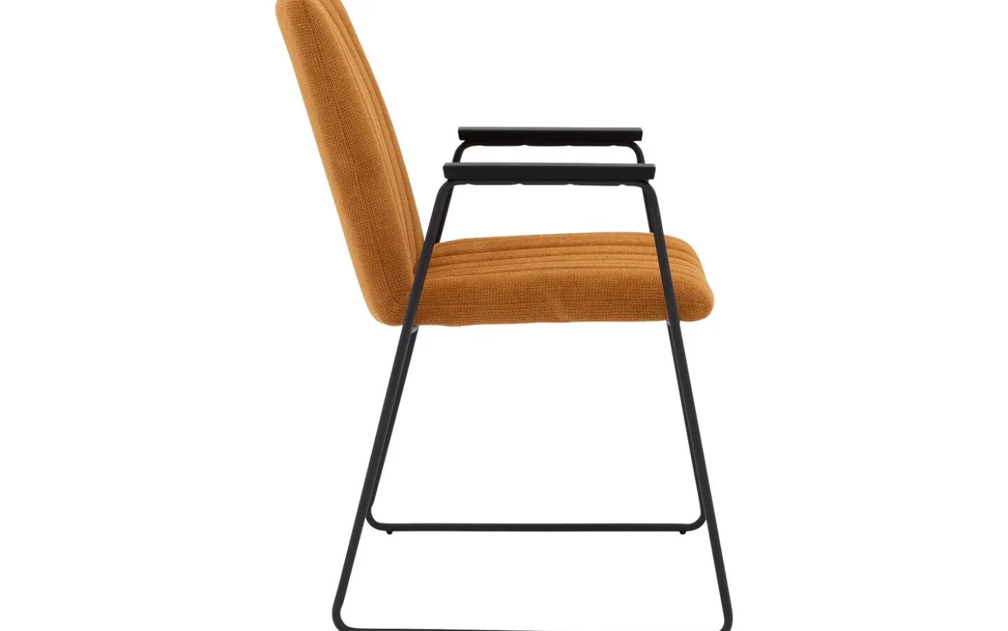 Gezellig tafelen met gele eetkamerstoel Manta met armleuning. Deze stoel valt op door de fijne lijnen en de grofgeweven kerriegele stoffering met verticale stiksels. De zwart metalen poot loopt naadloos over in een armleuning met fraaie armlegger, wat zorgt voor een eigentijdse en stijlvolle uitstraling. Perfect voor wie een urban industrieel interieur heeft of op zoek is naar een stoer accent aan de eettafel.