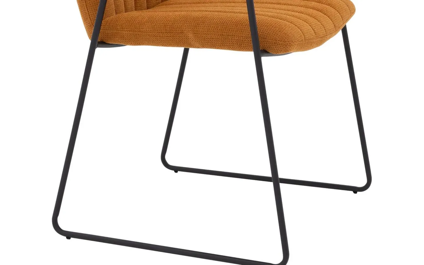 De grofgeweven kerriegele stof geeft eetkamerstoel Manta een warme en opvallende uitstraling. Door de verticale stiksels in de bekleding krijgt de stoel een bijzonder en uniek karakter. De ranke zwart metalen poot met poedercoating loopt elegant over in de armleuning en is afgewerkt met een mooie armlegger.
