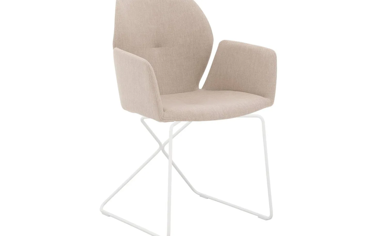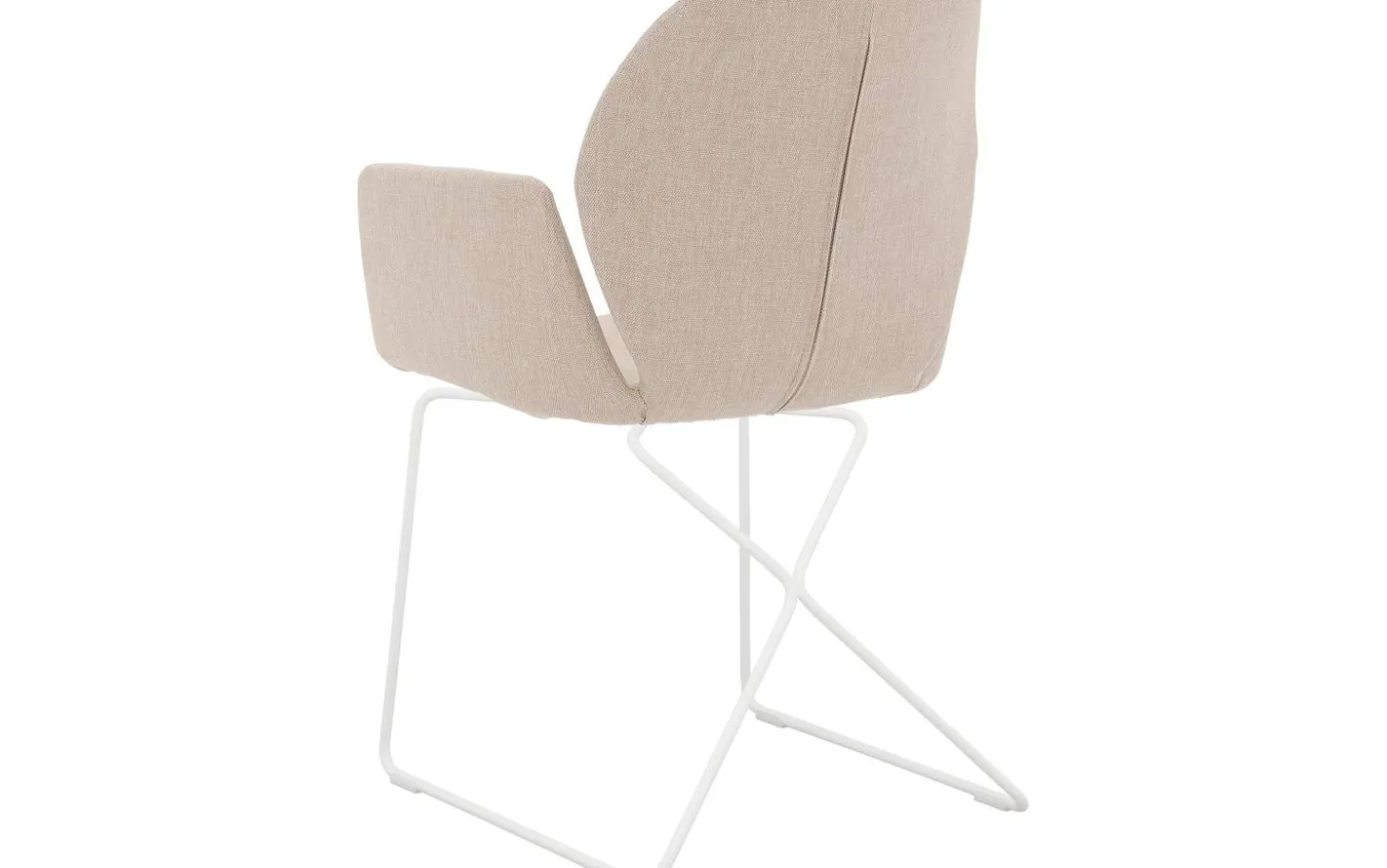 Der beige, fein gewebte Stoffbezug kombiniert wunderbar mit dem weißen Gestell und bietet eine neutrale, aber stilvolle Ausstrahlung. Dank der festen Polsterung behält der Stuhl seine klare, moderne Form und bleibt jahrelang schön. Die räumliche Konstruktion macht ihn zu einem echten Blickfang an Ihrem Esstisch.