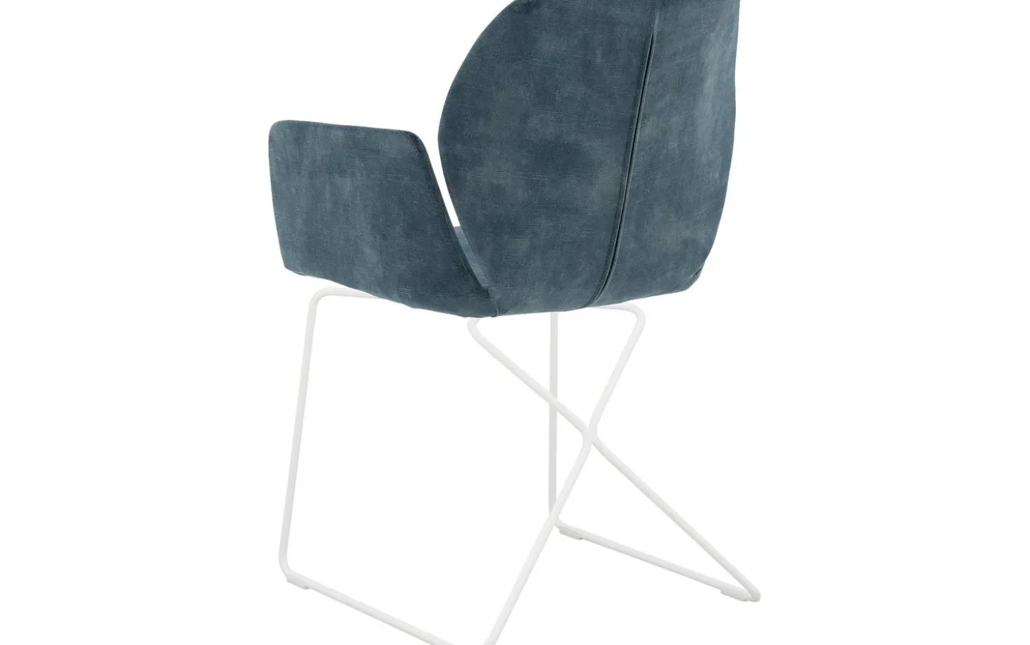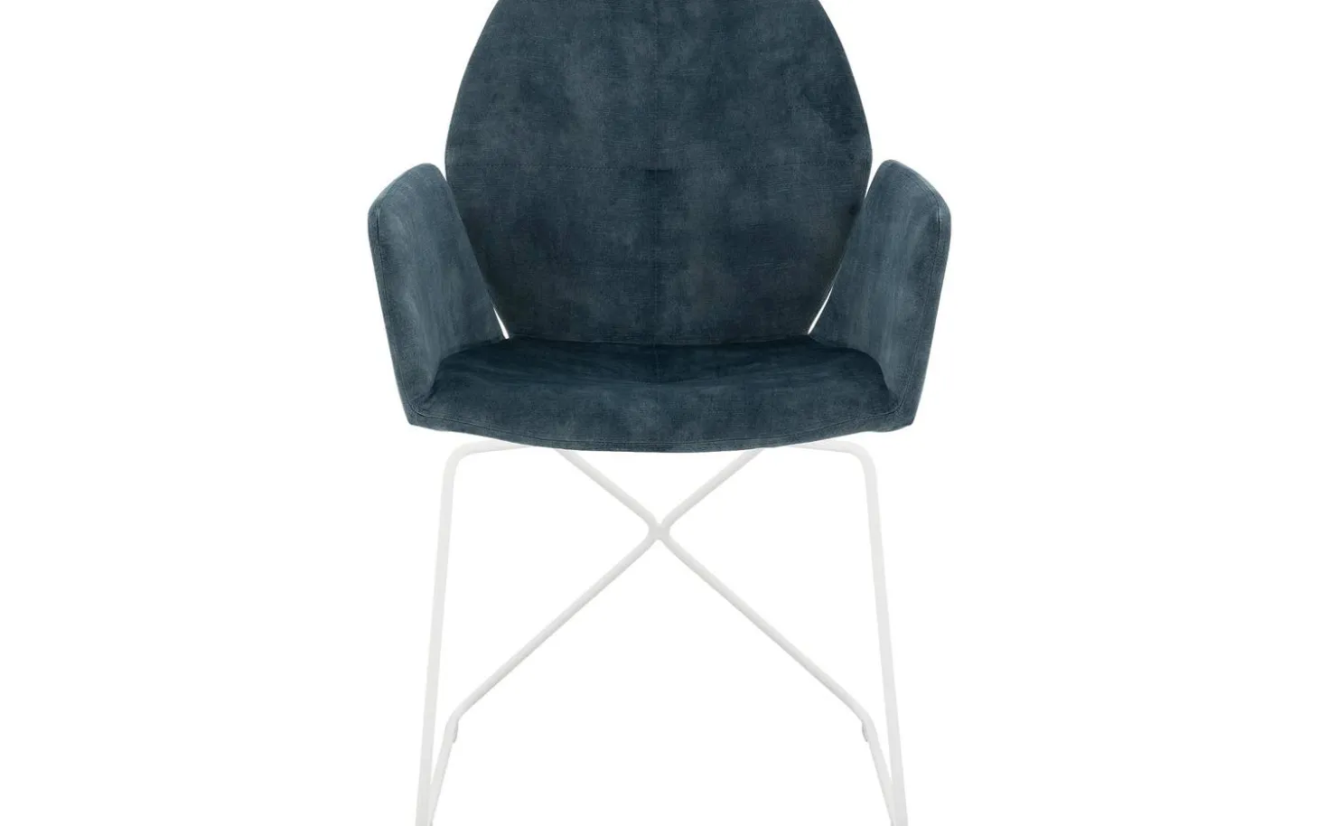 Das weiße pulverbeschichtete Untergestell bildet einen schönen Kontrast zur blauen Polsterung. Diese Kombination sorgt für eine dezente, aber einzigartige Ausstrahlung, die zu fast jedem Interieur passt. Durch die feste Polsterung behält der Stuhl jahrelang seine straffe Form.