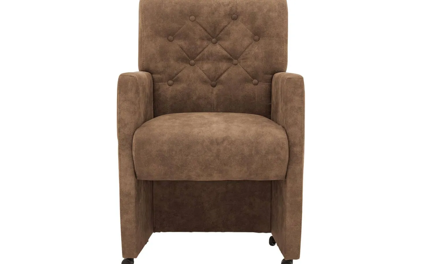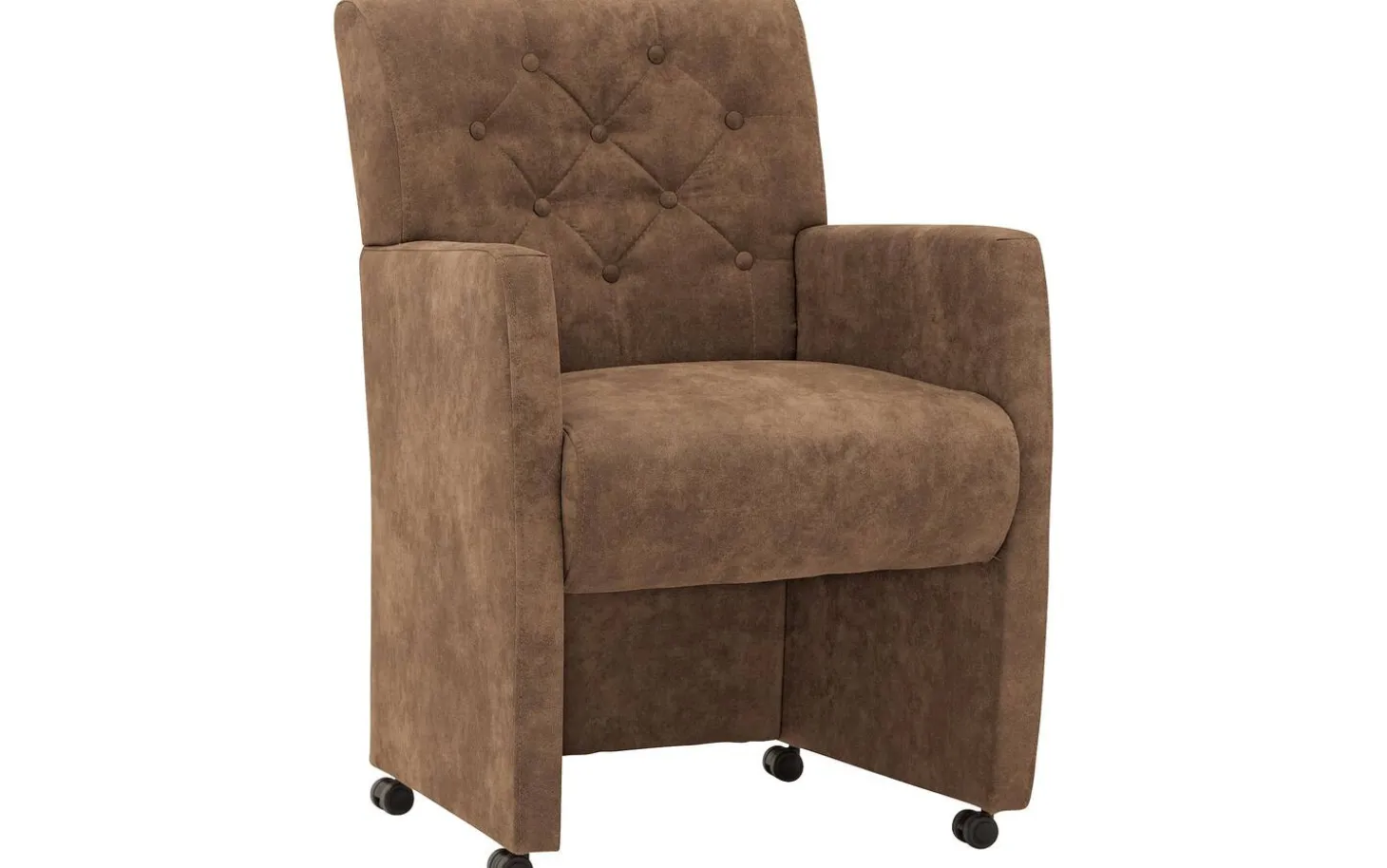 Betrachten Sie den Esszimmerstuhl Oliver! Dieser braune Esszimmerstuhl mit Armlehne ist mit einem weichen Mikrofaserstoff bezogen für eine warme Ausstrahlung in Ihrem Esszimmer. Die gesteppte Rückenlehne verleiht diesem Stuhl zusätzlichen Charme und Charakter. Mit den praktischen Rollen schieben Sie sich leicht an den Tisch und vom Tisch weg, während der praktische matt schwarze Griff dafür sorgt, dass Sie den Stuhl mühelos bewegen können. Perfekt für lange, gemütliche Abende am Esstisch.