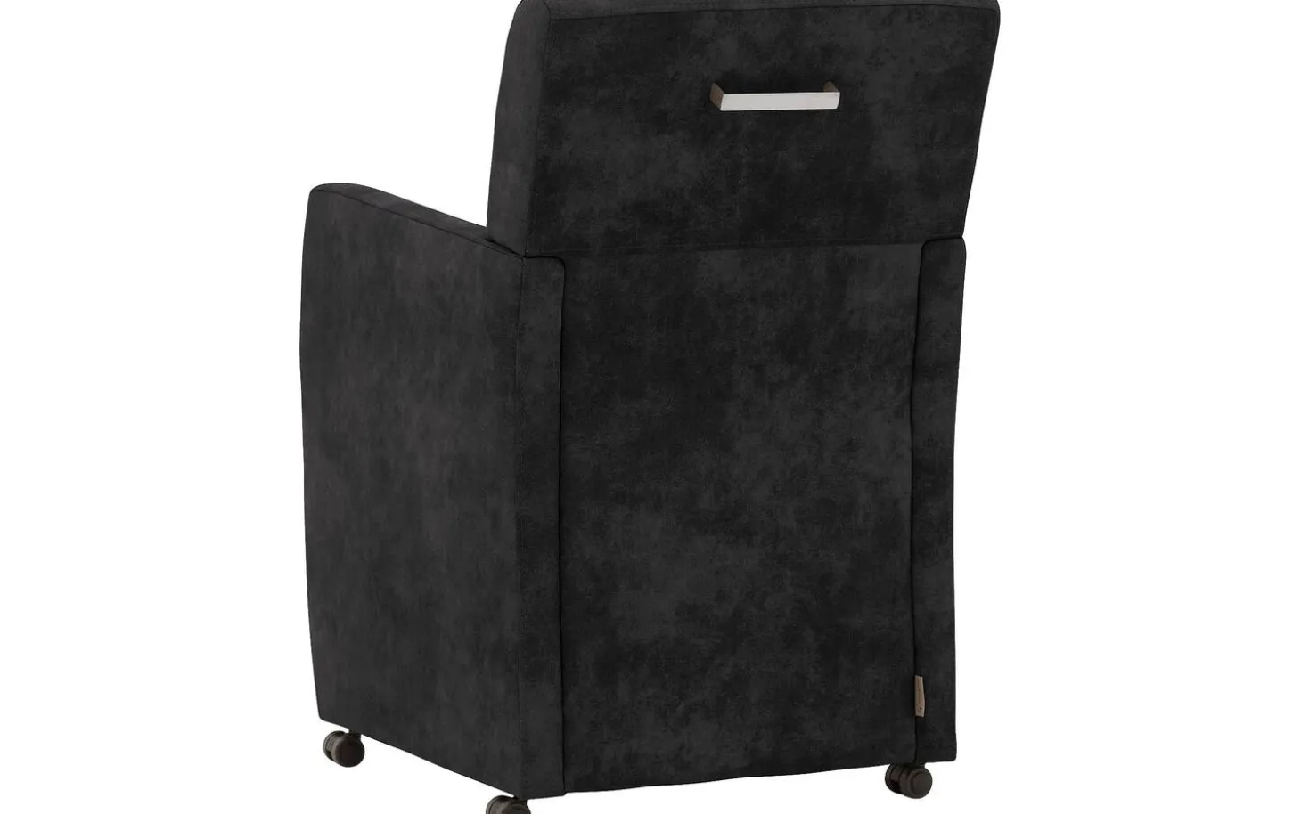 Machen Sie Ihr Esszimmer komplett mit dem grauen Esszimmerstuhl Oliver mit Armlehne. Dieser moderne Esszimmersessel ist mit weichem Mikrofaser in Anthrazit bezogen, was für eine warme Ausstrahlung in Ihrem Interieur sorgt. Durch den gesteppten Rücken erhält Oliver einen besonders charaktervollen Charme. Der Stuhl ist praktisch mit luxuriösen Rollen ausgestattet, sodass Sie beim Essen bequem an den Tisch rollen und aufstehen können. Am oberen Teil der Rückenlehne befindet sich ein praktischer silberfarbener Griff, mit dem Sie den Stuhl leicht bewegen können.