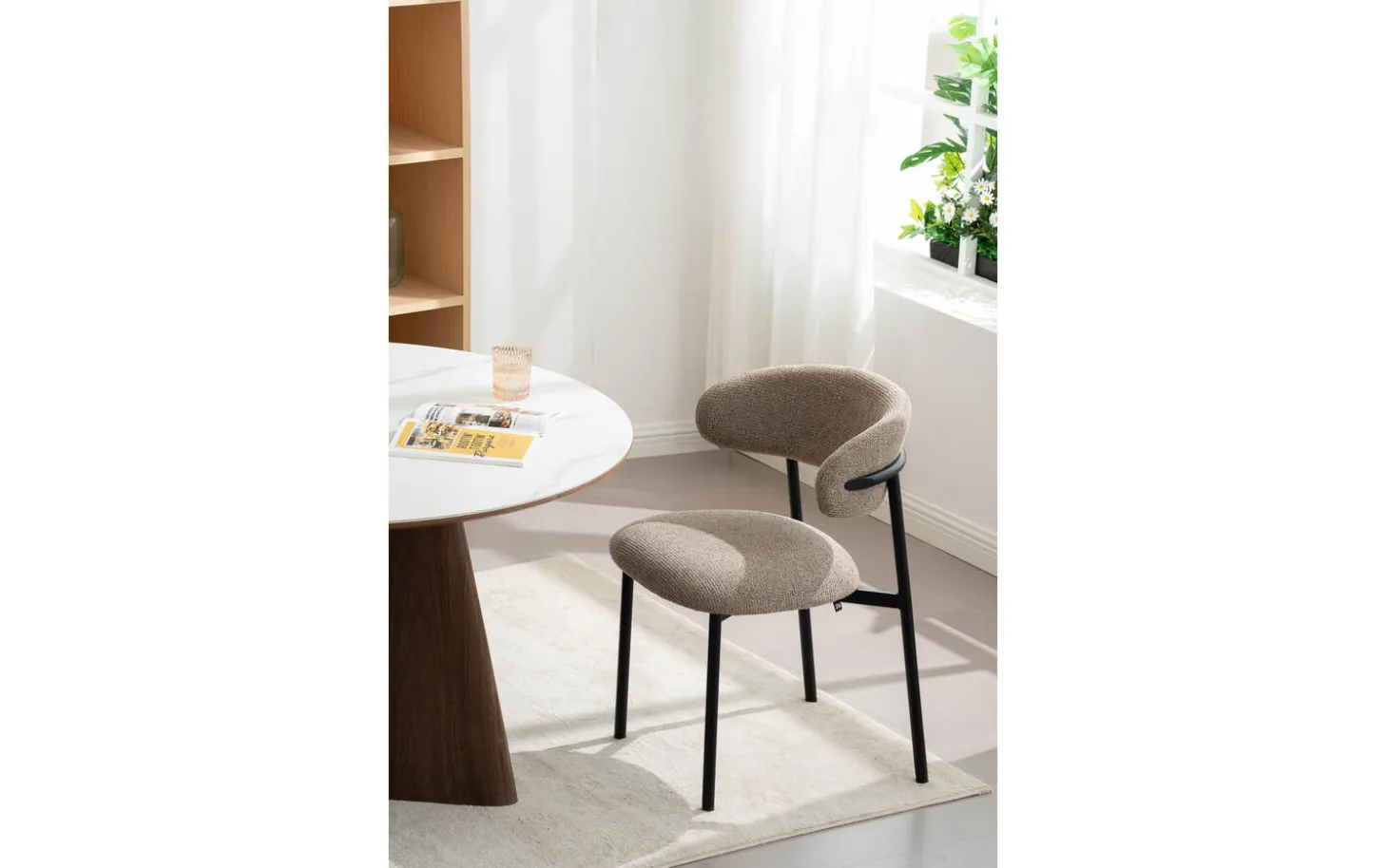 De grofgeweven bruine stof geeft eetkamerstoel Siem een natuurlijke en warme uitstraling. Deze stof is geschikt voor dagelijks intensief gebruik, zodat je er extra lang van kunt genieten. Het onderstel heeft een zwarte poedercoating die mooi contrasteert met de bruine bekleding.