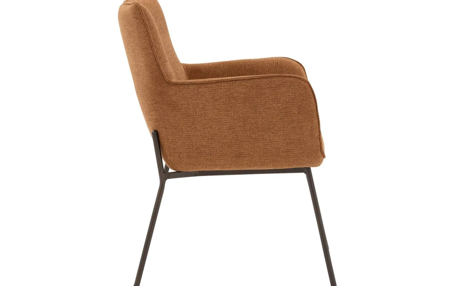 Der cognacfarbene grob gewebte Stoff verleiht dem Esszimmerstuhl Trullo eine reiche Textur, die Wärme und Tiefe in Ihr Esszimmer bringt. Das cognacfarbene Untergestell mit Pulverbeschichtung (anodic brown) passt schön zur Polsterung und sorgt für ein harmonisches Ganzes.