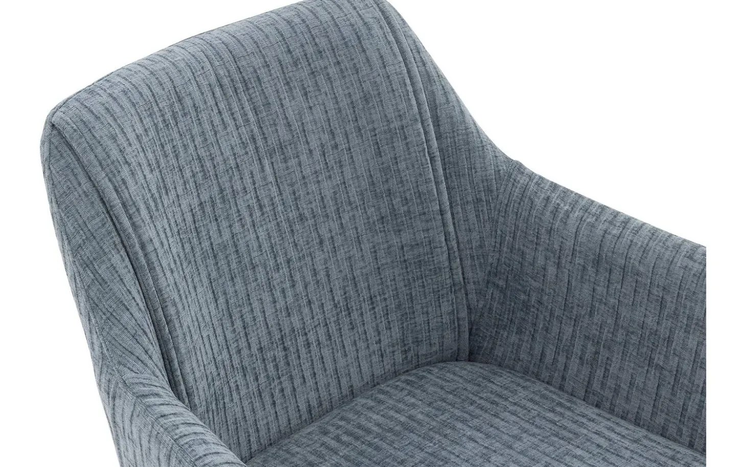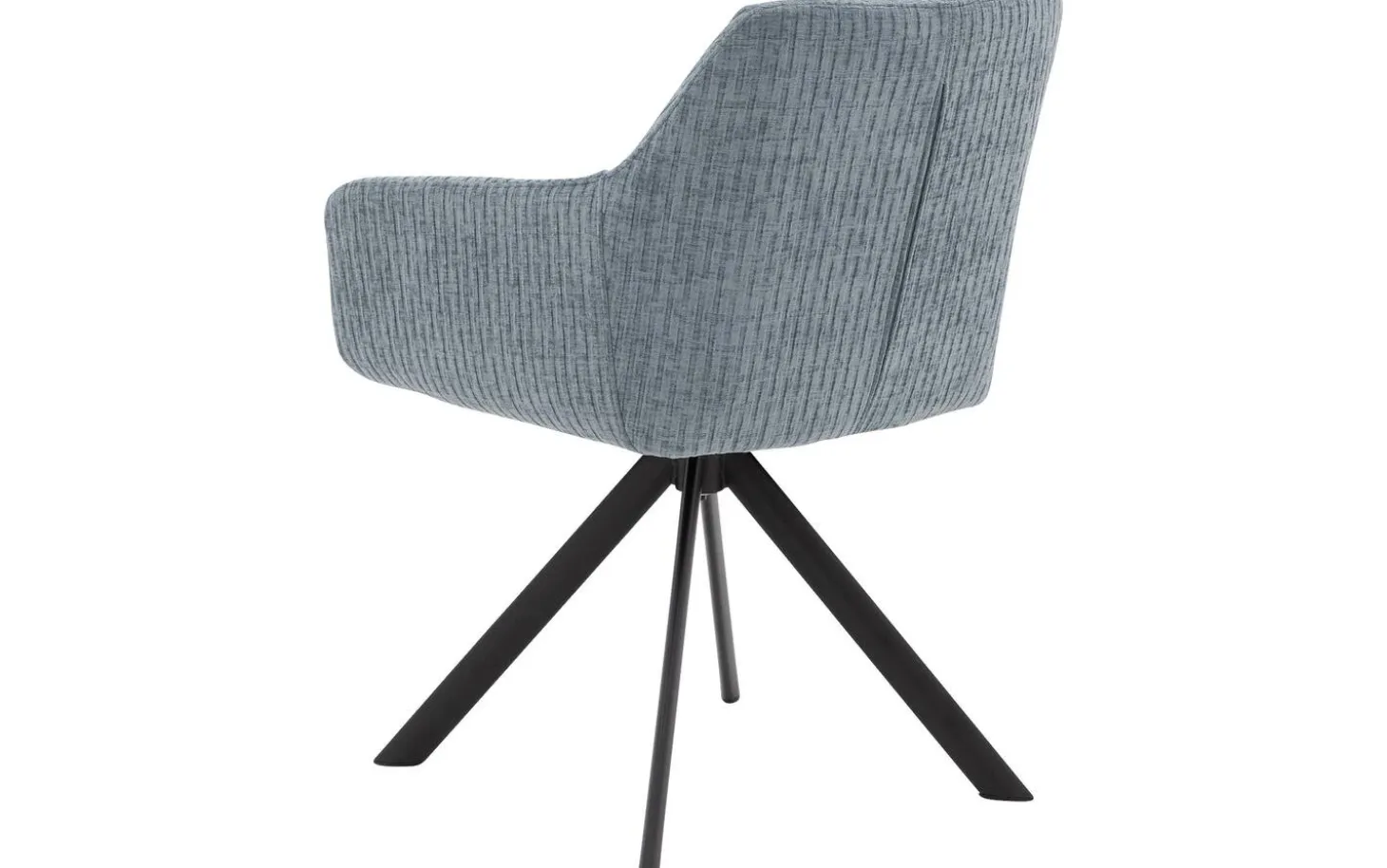 Gezellig tafelen met blauwe eetkamerstoel Ysmay met armleuning. Deze eigentijdse eetstoel combineert modern design met praktisch comfort. De handige 360 graden draaifunctie maakt het makkelijk om aan te schuiven bij de eettafel. De trendy blauwe ribstof geeft je eetkamer een speelse en frisse uitstraling. Dankzij de comfortabele schuimvulling geniet je volop van lange diners met familie en vrienden.