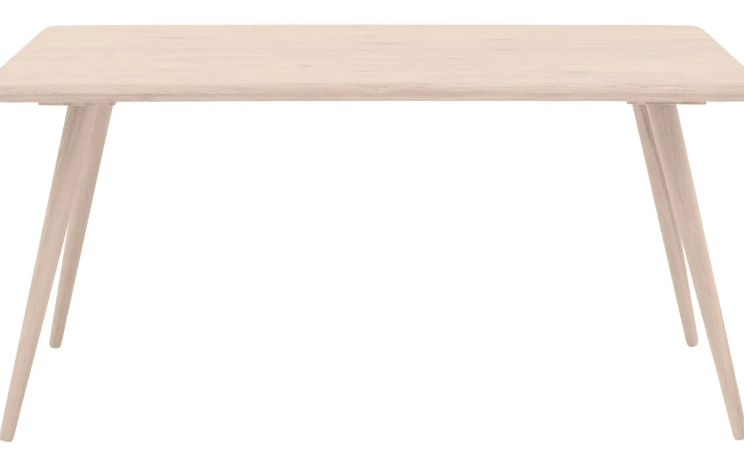 Esstisch Bjarte bringt Retro-Charme in Ihr Esszimmer. Dieser weiße rechteckige Eichenesstisch fällt durch seine sanften runden Formen und weit ausladenden Beine auf. Das lackierte Eichenholz hat eine natürliche Maserung und hält dank der Lackschicht jahrelang. Perfekt für gemütliche Abendessen mit der Familie.