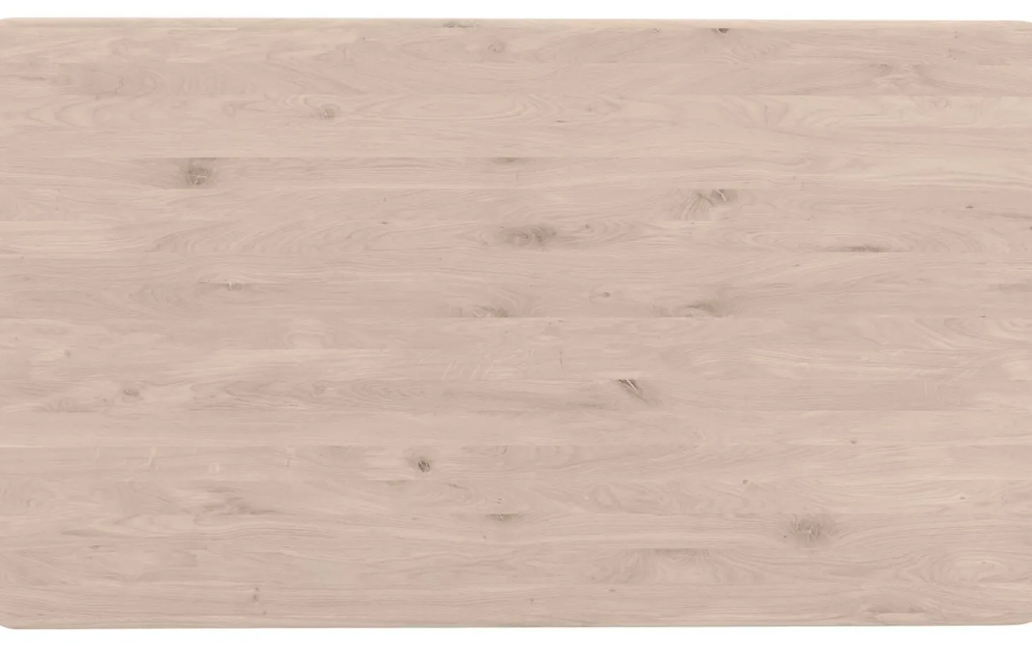 Die cremeweiße Tischplatte ist aus massivem Eichenholz mit einer schützenden Lackschicht gefertigt. Diese Verarbeitung sorgt dafür, dass das Holz weniger schnell Flüssigkeiten aufnimmt und verringert die Gefahr von Flecken und Ringen. Die natürlichen Maserungen verleihen jedem Exemplar einen einzigartigen Charakter.