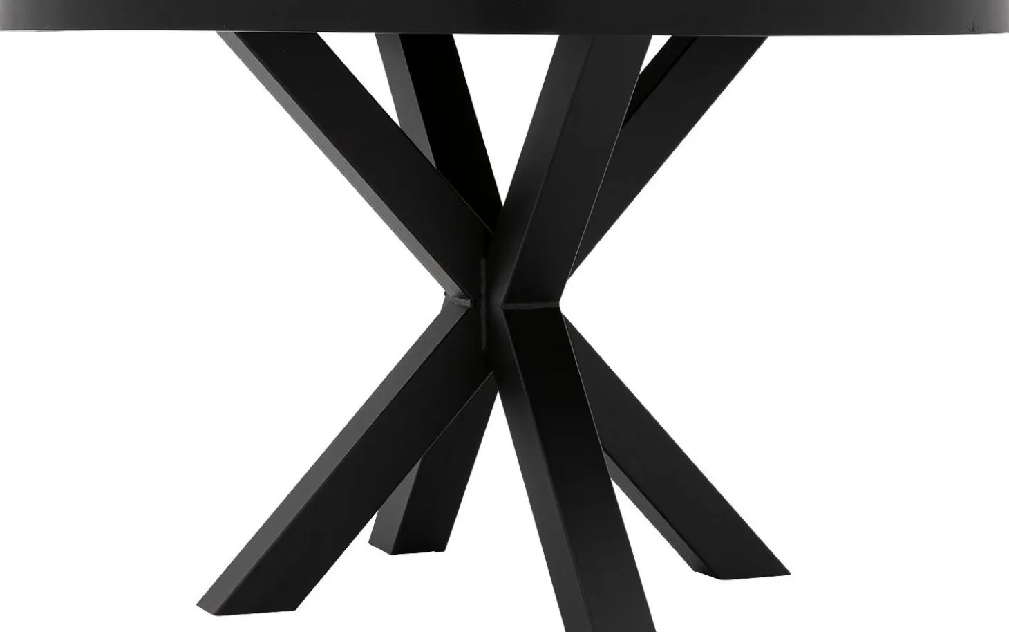 Das Untergestell besteht aus einem auffälligen Kreuzfuß aus schwarz pulverbeschichtetem Metall. Diese Konstruktion sorgt nicht nur für Stabilität, sondern ist auch ein echtes Statement in Ihrem Essbereich. Verstärkungsprofile unter der Platte halten den Tisch jahrelang in perfekter Form.