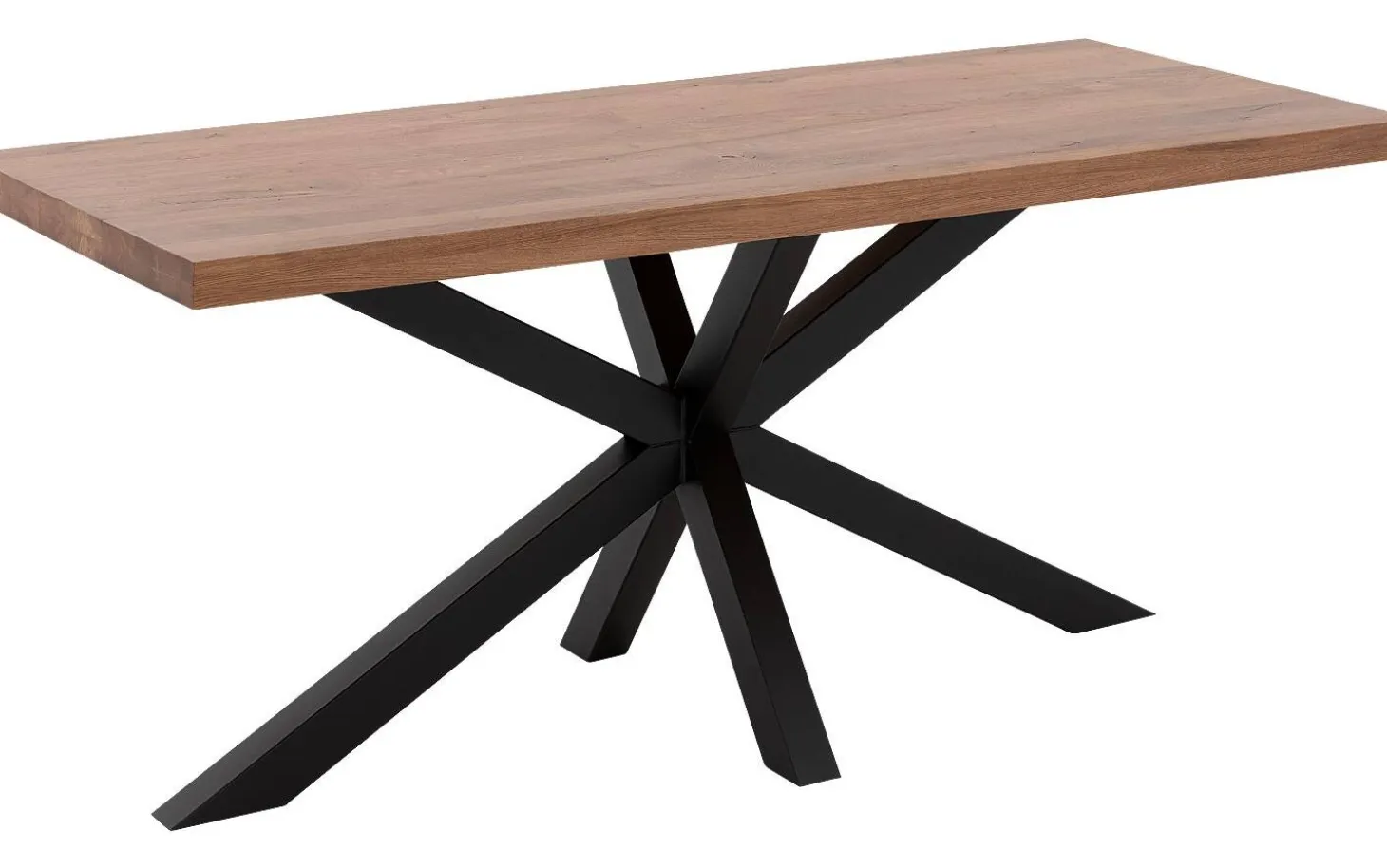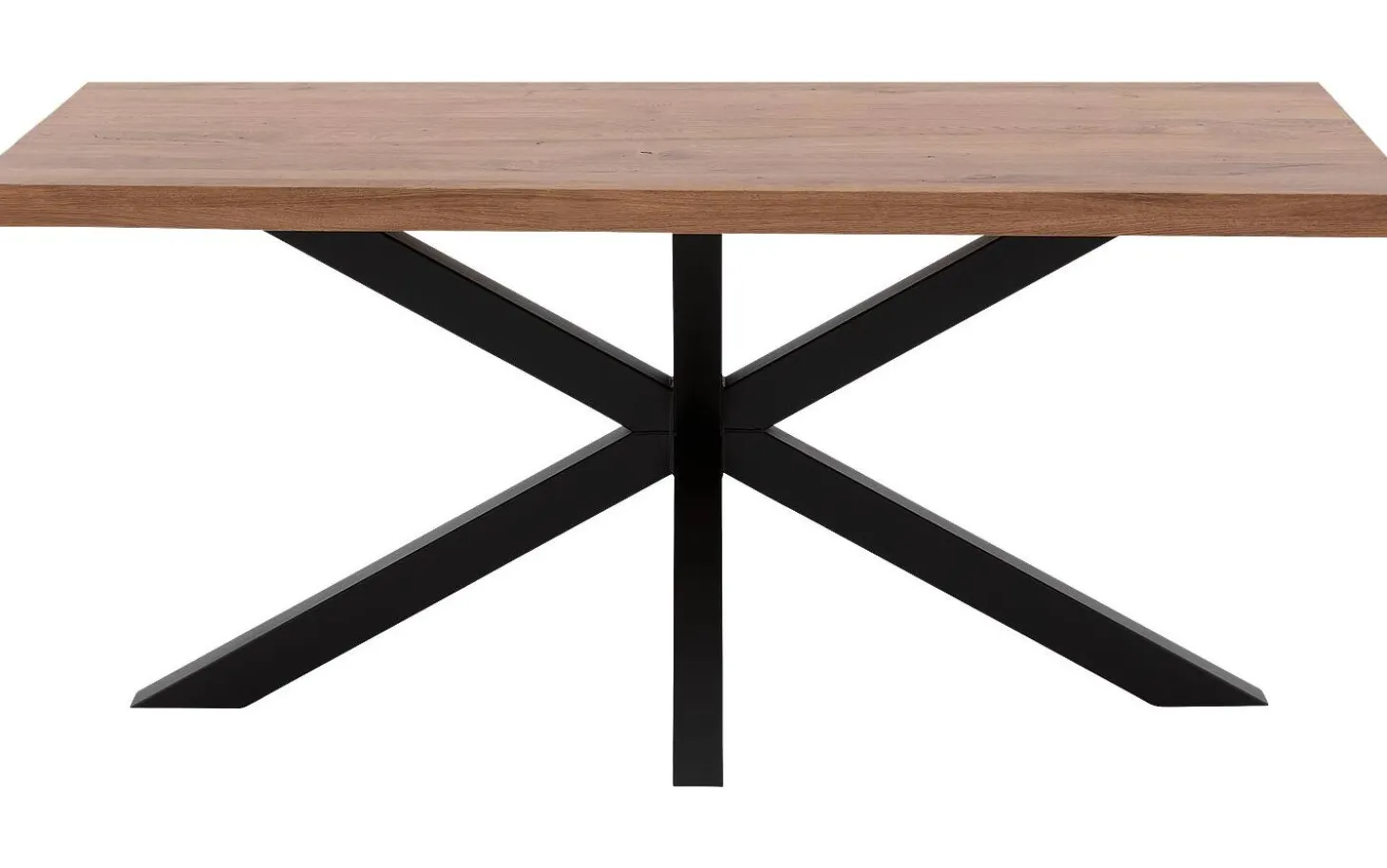 Das Kreuzfuß-Untergestell aus schwarzem Metall hat eine Pulverbeschichtung für zusätzlichen Schutz. Verstärkungsprofile unter der Platte sorgen dafür, dass der Tisch jahrelang seine Form behält. Durch die intelligente Fußplatzierung haben Sie optimale Beinfreiheit.
