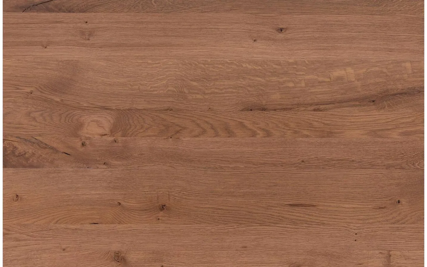 Die Tischplatte ist aus massivem Eichenholz mit einem schützenden Soft-Touch-Lack gefertigt. Diese Veredelung bewahrt die natürliche matte Ausstrahlung und sorgt für weniger Ränder und Kratzer. Der gerade Tischrand von 6 cm Dicke verleiht ein geradliniges und robustes Gesamtbild.