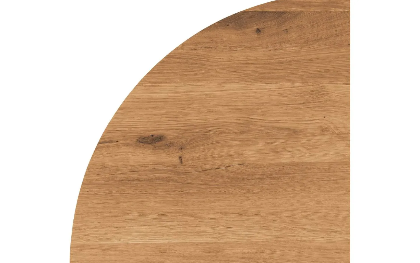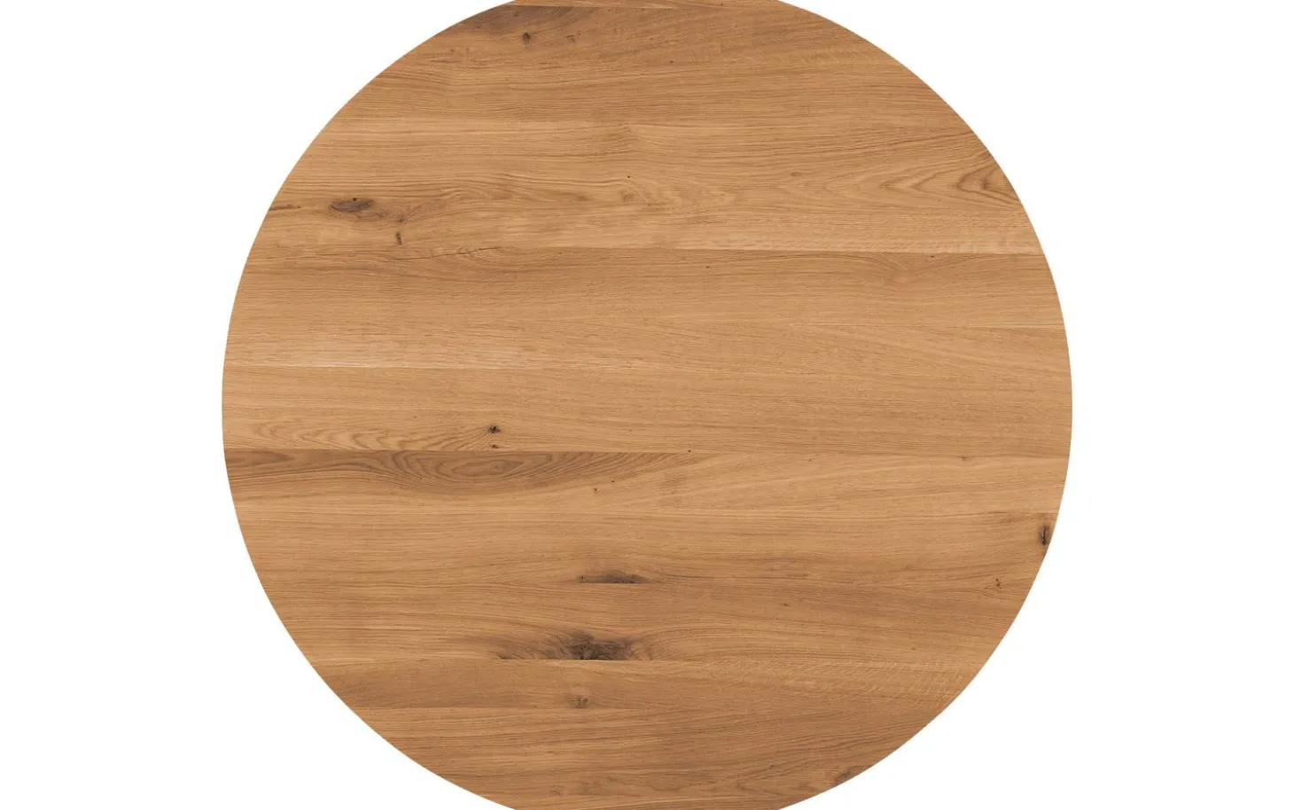 Die Tischplatte ist fachmännisch aus massivem Eichenholz im Naturton gefertigt. Der Soft-Touch-Lack bewahrt die natürliche matte Ausstrahlung und schützt vor Kratzern und Ringen. Dank der geraden Kantenverarbeitung erhält die Platte einen klaren, zeitlosen Look.