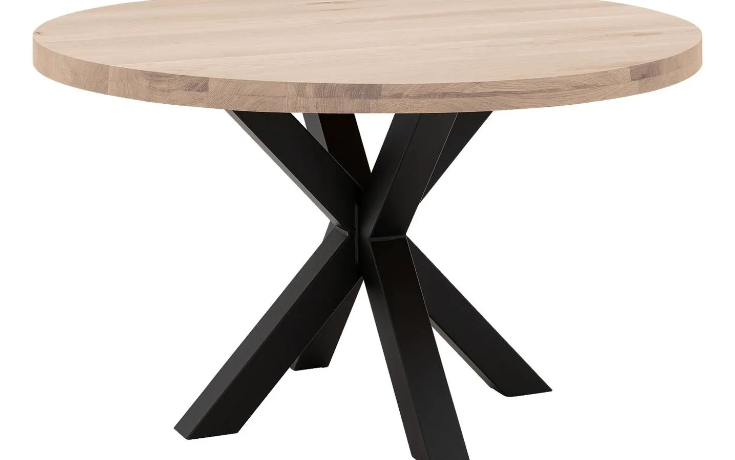 Der Esstisch Blade hat eine runde Form, die das Tafeln besonders gemütlich macht. Der auffällige Kreuzfuß aus schwarzem Metall verleiht dem Tisch eine robuste, industrielle Ausstrahlung. Die Kombination aus weißem Eichenholz und schwarzem Metall sorgt für einen modernen Touch mit natürlicher Wärme.