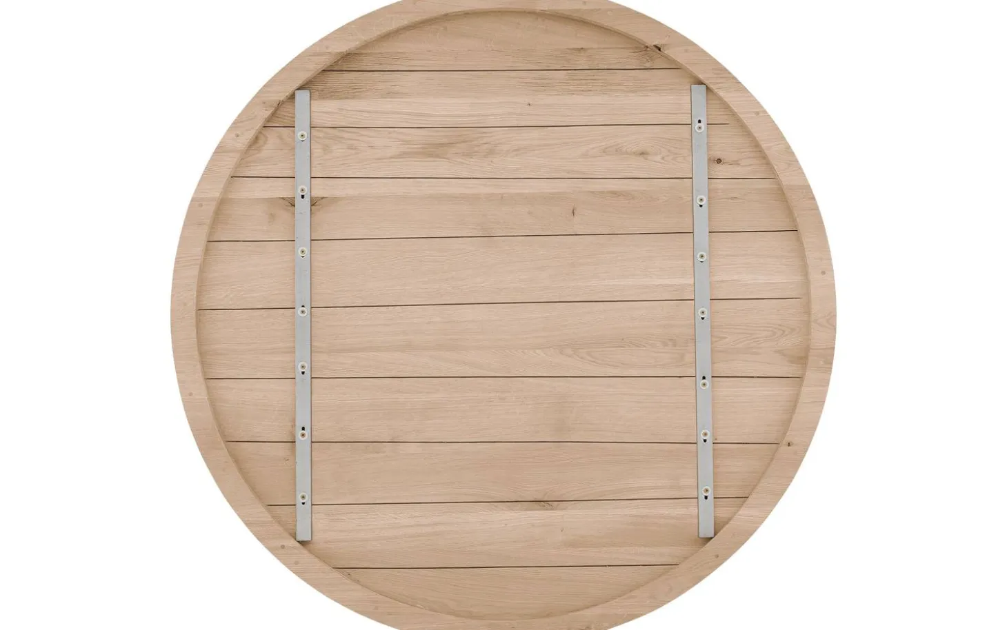 Die runde Platte ist aus solidem Eichenholz mit einer White-Wash-Veredelung gefertigt. Der Soft-Touch-Lack schützt vor Kratzern und Wasser, während die natürliche Maserung sichtbar bleibt. Die Platte hat eine Dicke von 6 cm mit gerader Tischkante für einen straffen Look.